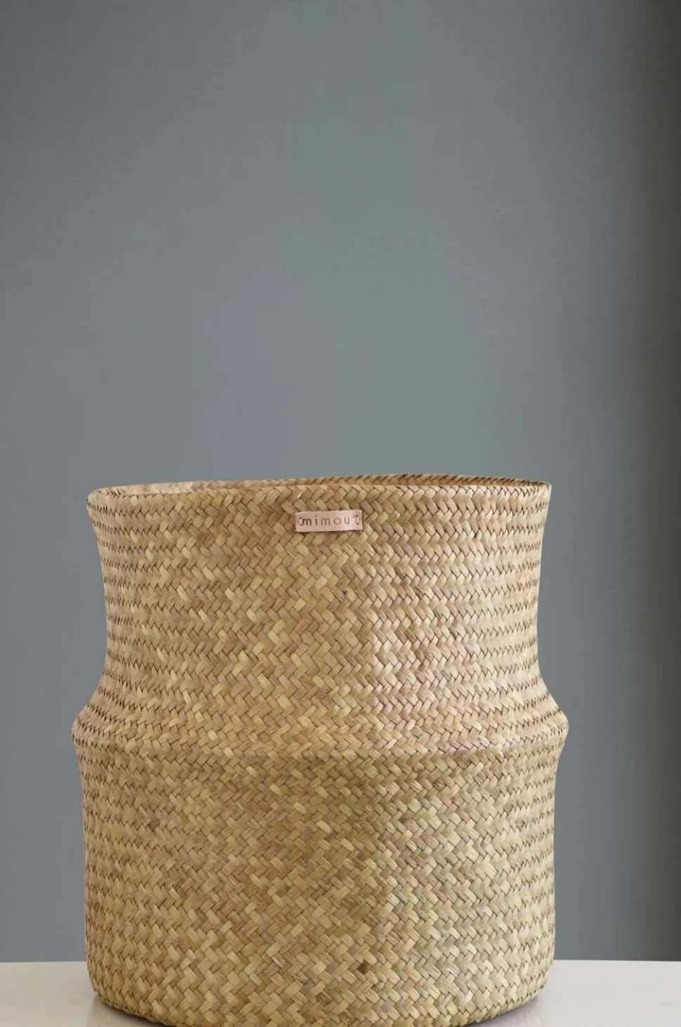 Rund kurv som er håndflettet af søgræs af et kollektiv i det sydlige Thailand. Kurven har en foldet kant, som gør at man kan justere højde og udseende. Størrelsen egner sig som lidt lavere vasketøjskurv, papirkurv, potteskjuler til gulvplanter samt til opbevaring af legetøj eller ugeblade. Stabil, dobbeltflettet model. Højde 40 cm (20 cm når den er foldet ned) Ø 38 cm.
