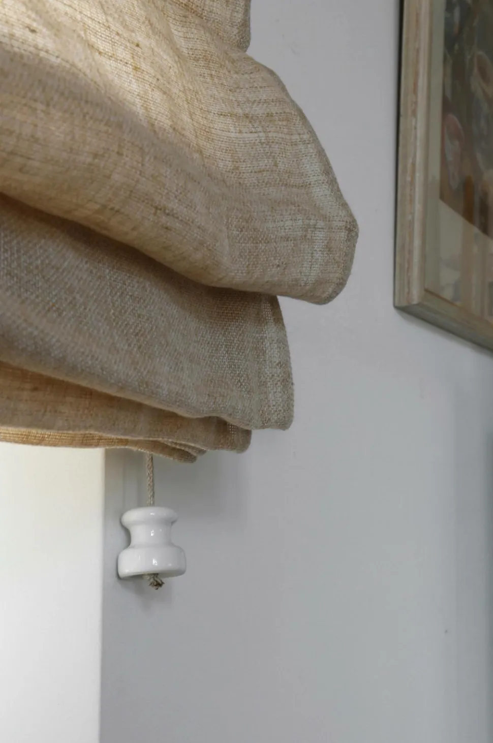 Mimous liftgardin er 220 cm langt hvilket gør at det også passer i lidt højere vindue samt de fleste glasdøre. Stoffet er vævet med kraftige hørtråde og genindvundet polyester og har en smuk tekstur, som lyset filtrerer igennem, men stadig er let nok til at se igen. Liftgardinet er skræddersyet med smalle sidefolder og med lægter, der giver stramme læg ved foldning. Afstanden mellem lægterne gør, at liftgardinet foldes smukt sammen, uanset hvilken højde du vælger at have det på. Det er lige så fint i fuld optrukket position, som når det hænger helt ned eller er højdejusteret, hvor sømmene til lægterne er placeret. Det kan naturligvvis justeres frit. Stoffet er monteret med velcrobånd på en stabil aluminiumsprofil, der kan monteres både i loft og på væg. Linerne fra lægterne samles i en linedeler som er designet til at blive separeret, hvis dit barn eller et husdyr bliver viklet ind i linerne. Længst nede på snøren af vævet svensk hør sidder en klassisk porcelænsknop fremstillet i Bromölla. Beslag og snorholder medfølger. Set forfra sidder snoretrækket i højre side. Det er vigtigt at snøre linen ordentligt rundt om knoppen hver gang højden justeres, så der ikke hænger lange snore ned, som små børn eller husdyr kan blive viklet ind i. Stoffet er OEKO-TEX® Standard 100 certificeret, det vil sige at produktet er testet for at sikre, at det ikke indeholder sundhedsskadelige stoffer.