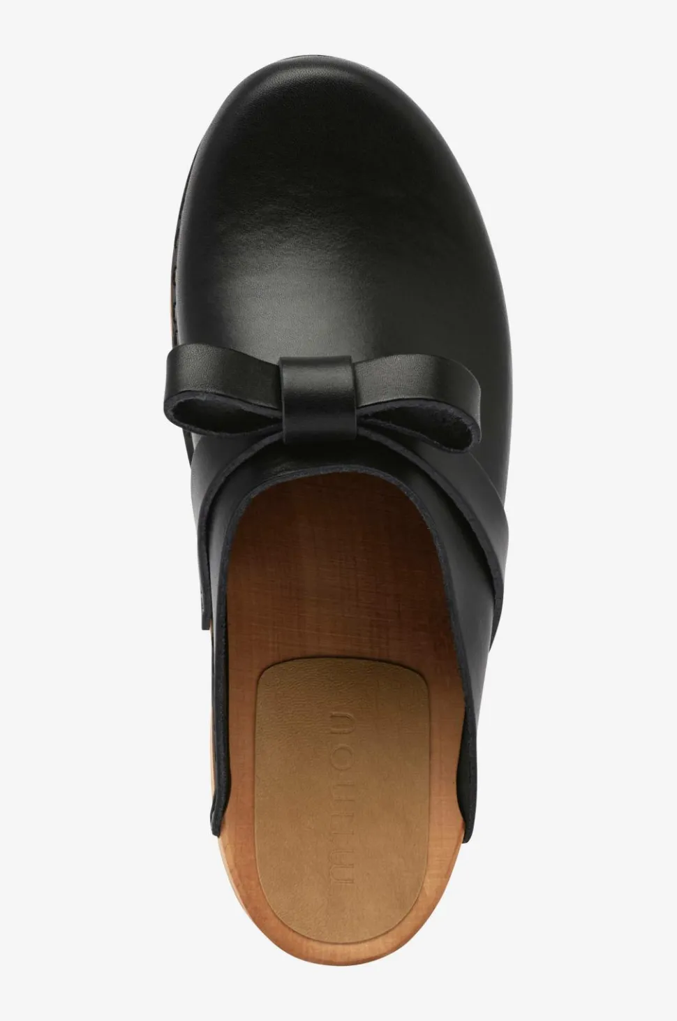 I år fylder Mimou 20 år, og det fejrer de med forskellige produktlanceringer i løbet af året, som længe har stået på deres bucket list. Først ud er en træsko designet af Karin Mannerstål med en stram sløjfe. Grunden til, at valget faldt på Karin til dette designsamarbejde, var helt naturlig. Det var Karin, der skabte Mimous logo for 20 år siden, og Karin er både glad for træsko og sløjfer. Med hendes selvfølgelige og klare designsprog var valget let. Ud over god produktion er Mimou passioneret omkring kontekst, så da de fandt en andengenerations skomagerfamilievirksomhed i de dybe skove i Småland, fik de endelig mulighed for at gøre deres længe ønskede træsko til virkelighed.