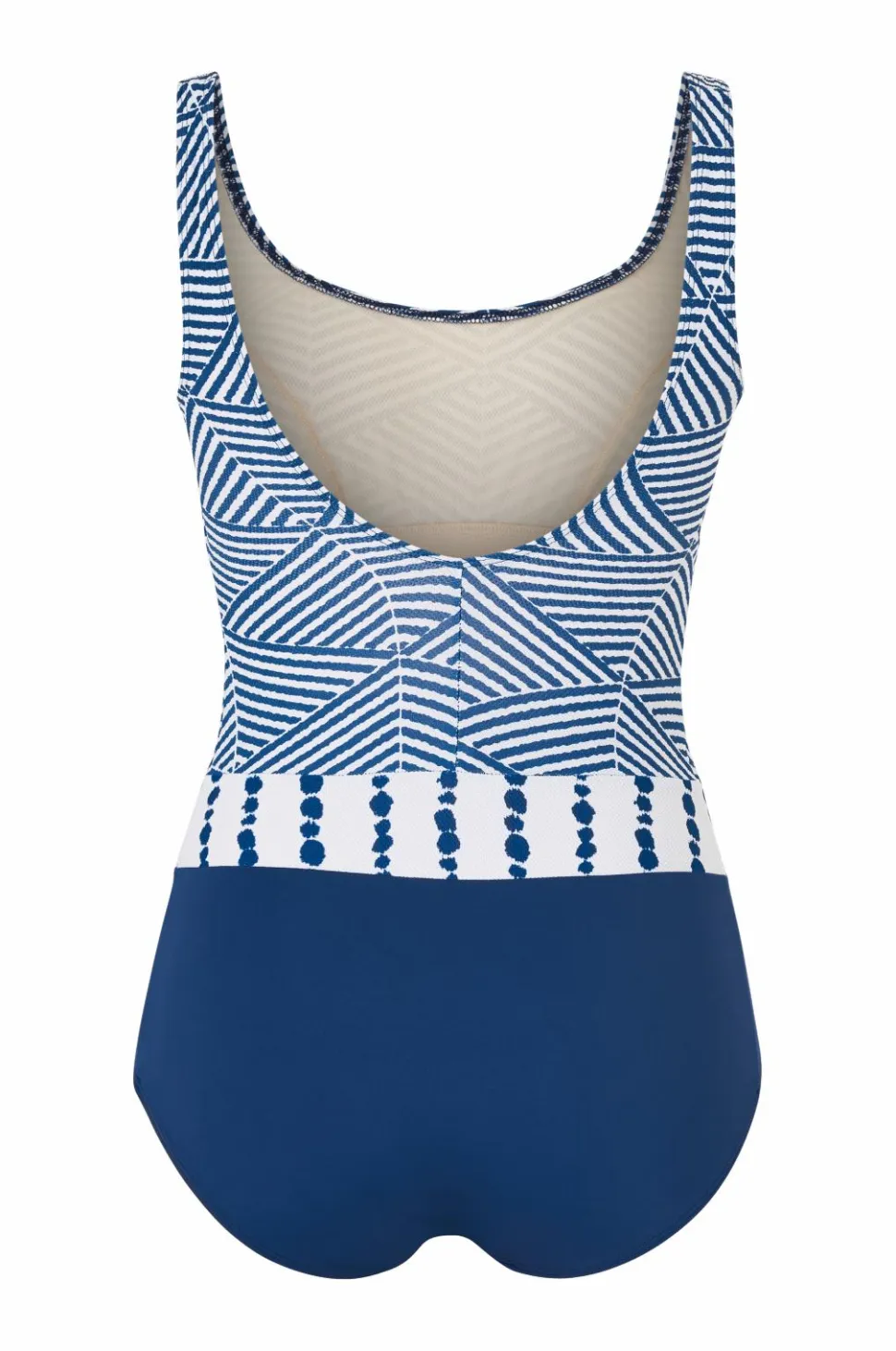 En badedragt, der på slående vis kombinerer to forskellige mønsterprint med ensfarvede farver.