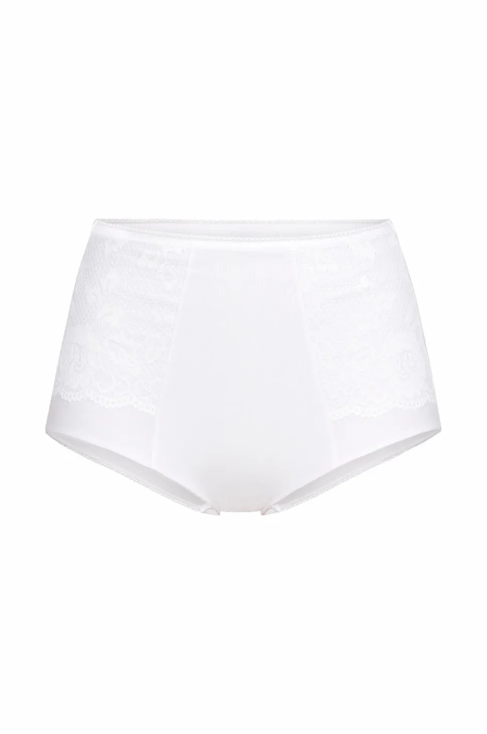 Skøn blondetrusse fra Miss Mary of Sweden i en taljehøj model med let formende effekt på mave og talje. Kraftig jersey, hvor fronten er foret med åndbart mesh. Smal elastik i taljen og benåbning. Dekorative blondepaneler foran. Skridtet er foret med bomuld.