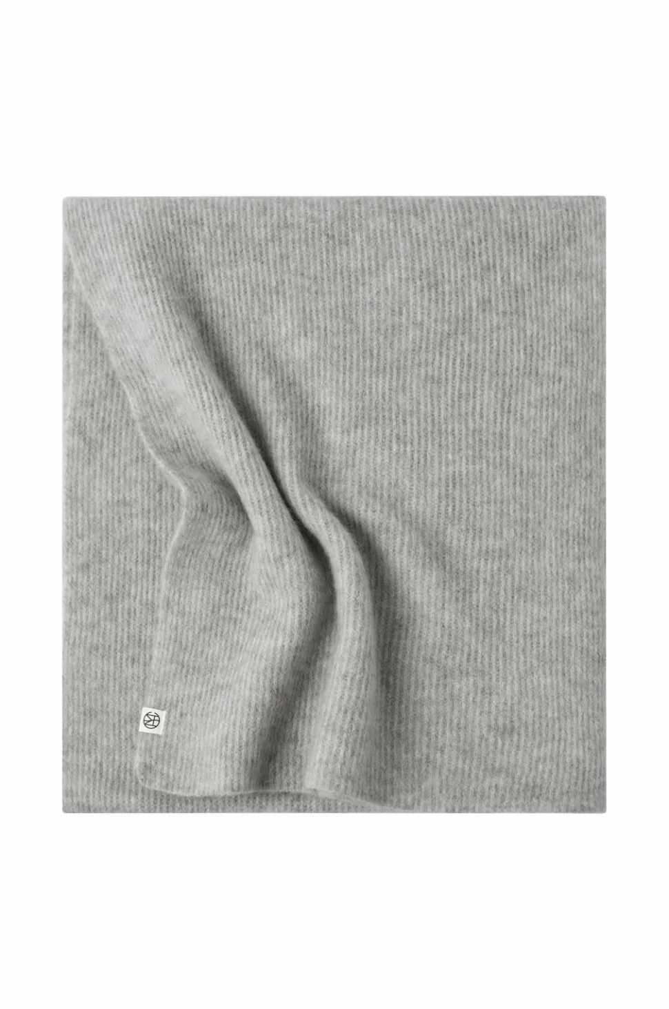 • Blødt, fintstrikket, stort halstørklæde med påsyet logomærke på den ene side