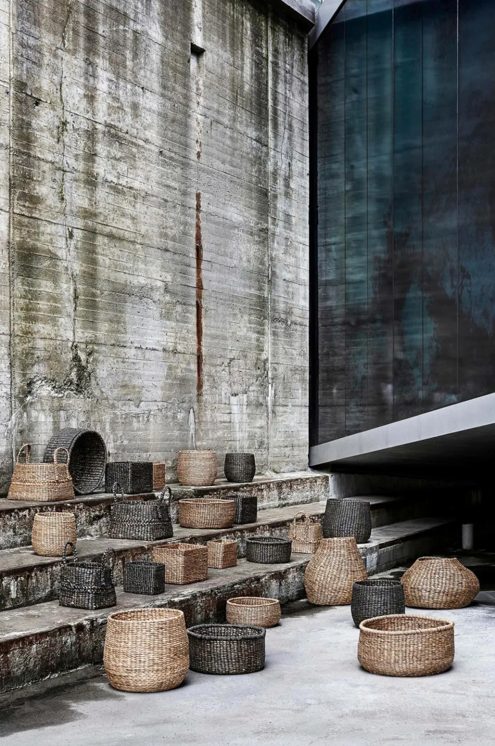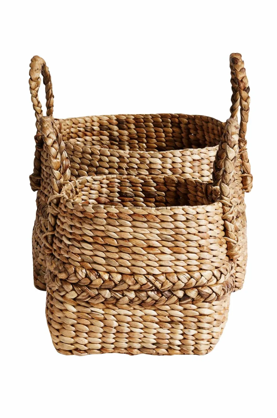 Kurvesættet Handle i vandhyacint består af to kurve i to forskellige størrelser. Kurvene kan bruges til opbevaring eller som vasketøjskurv. L: Bredde 46 cm, dybde 46 cm og højde 31 cm (- håndtag). S: Bredde 32 cm, dybde 32 cm og højde 27 cm (- håndtag).
