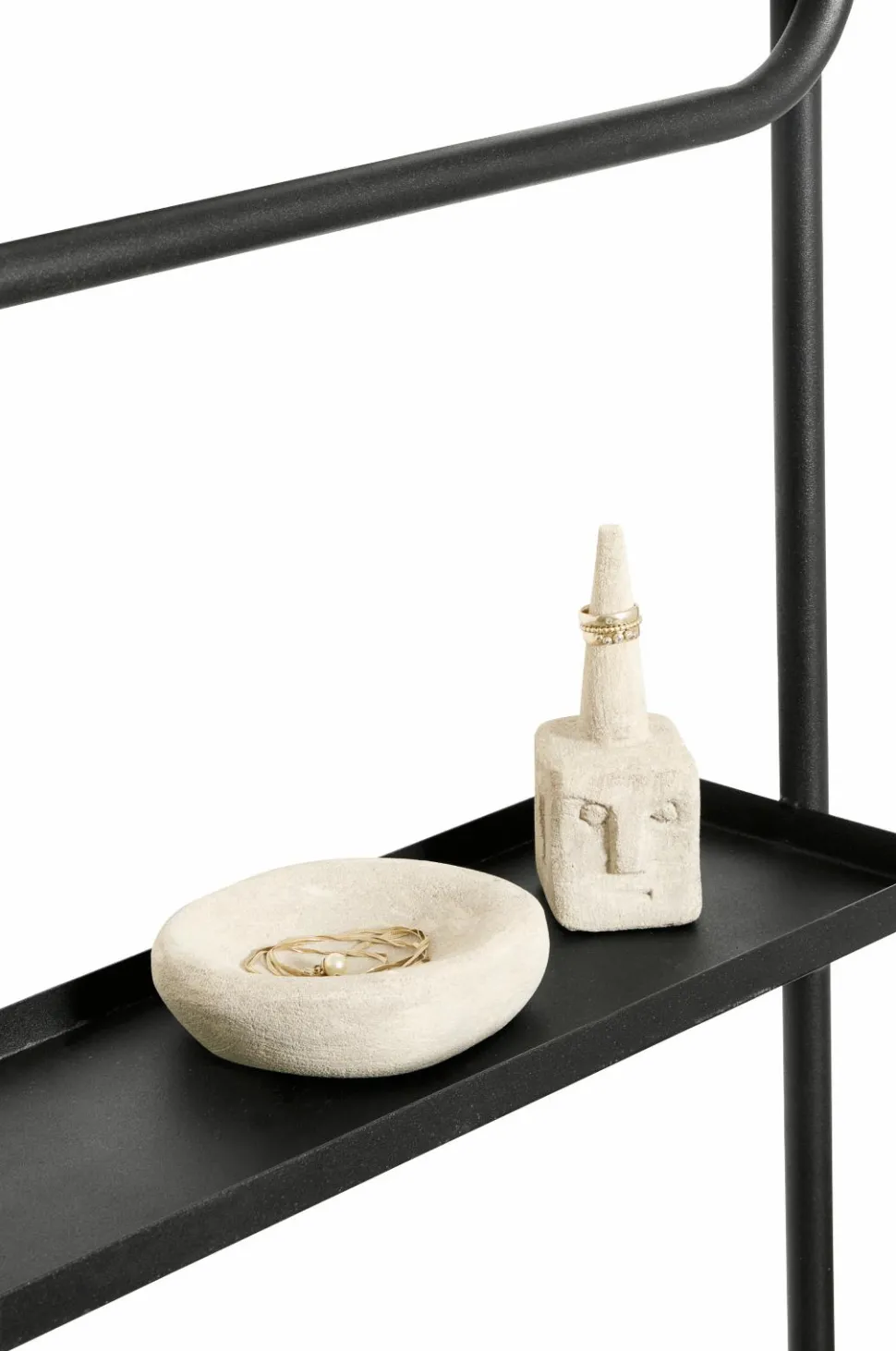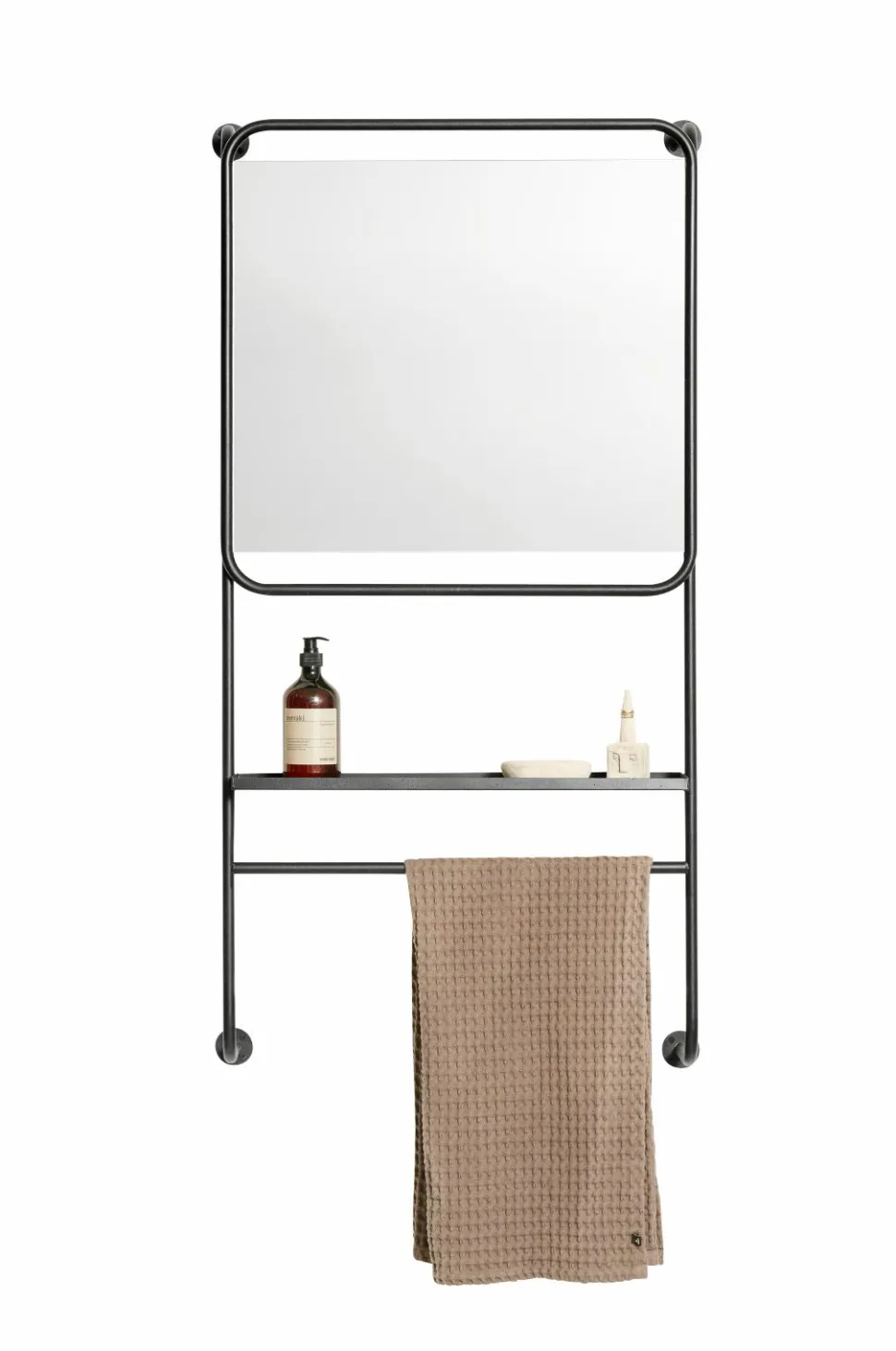 Spejl med ramme i sort jern fra Muubs. Her forenes funktionalitet og design. Rammen til spejlet er designet med to hylder, som er velegnede til opbevaring. Derudover har den praktiske stænger, hvor du kan hænge kroge på, hvilket skaber uendelige stylingmuligheder. Brug f.eks. spejlreolen i entreen, på badeværelset eller i soveværelset.