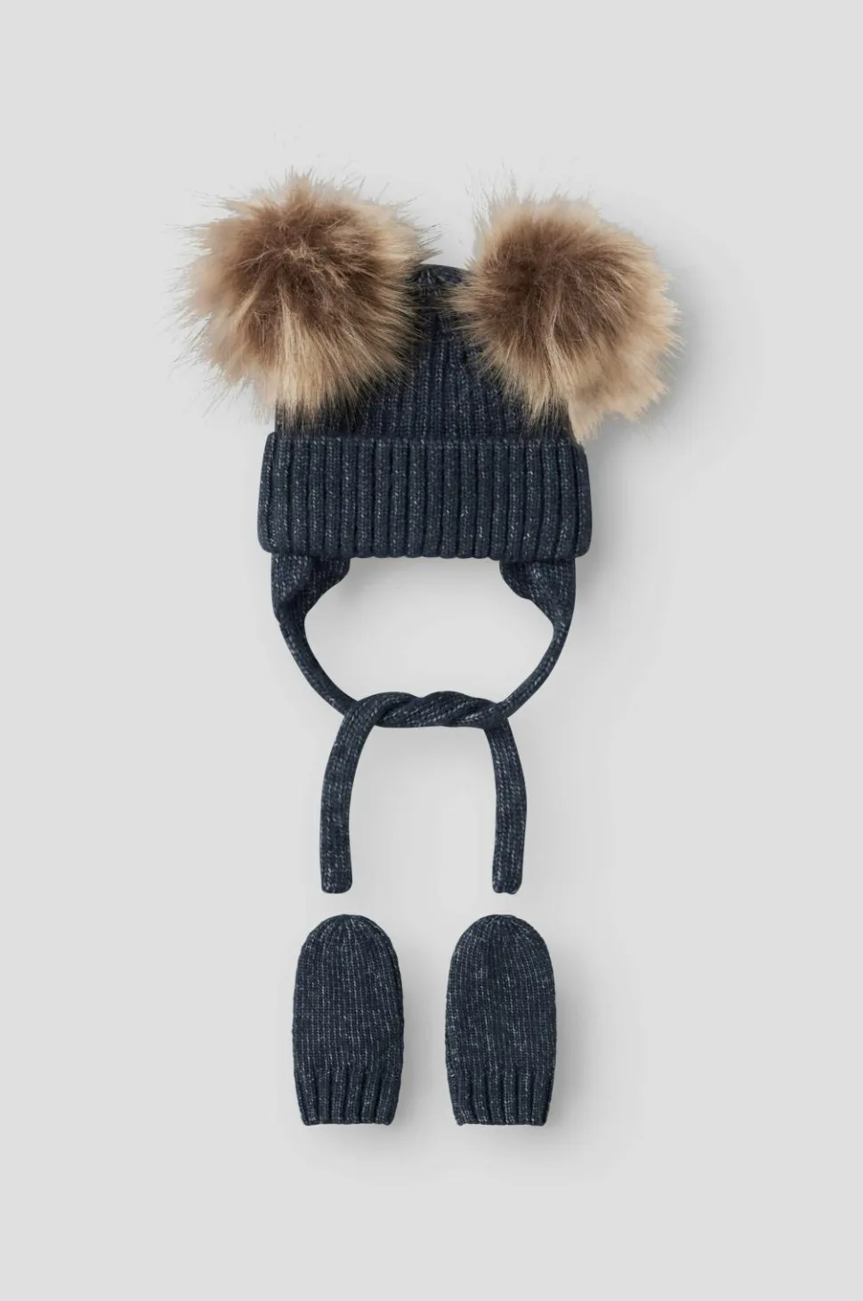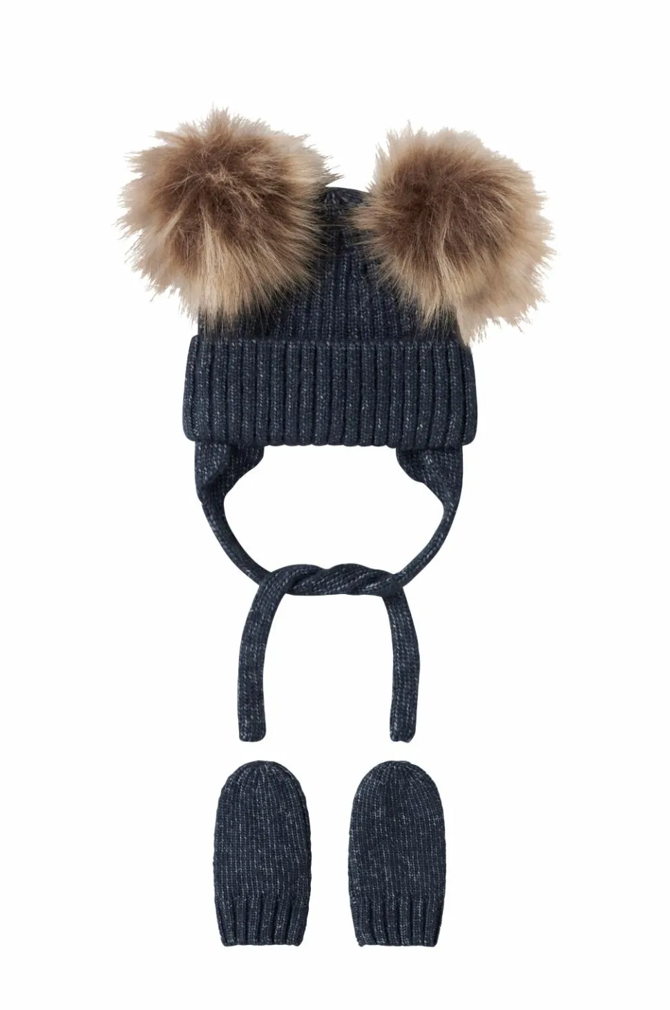 • Ribstrikket babyhue med to pomponer i kunstskind og bindbart bånd under hagen