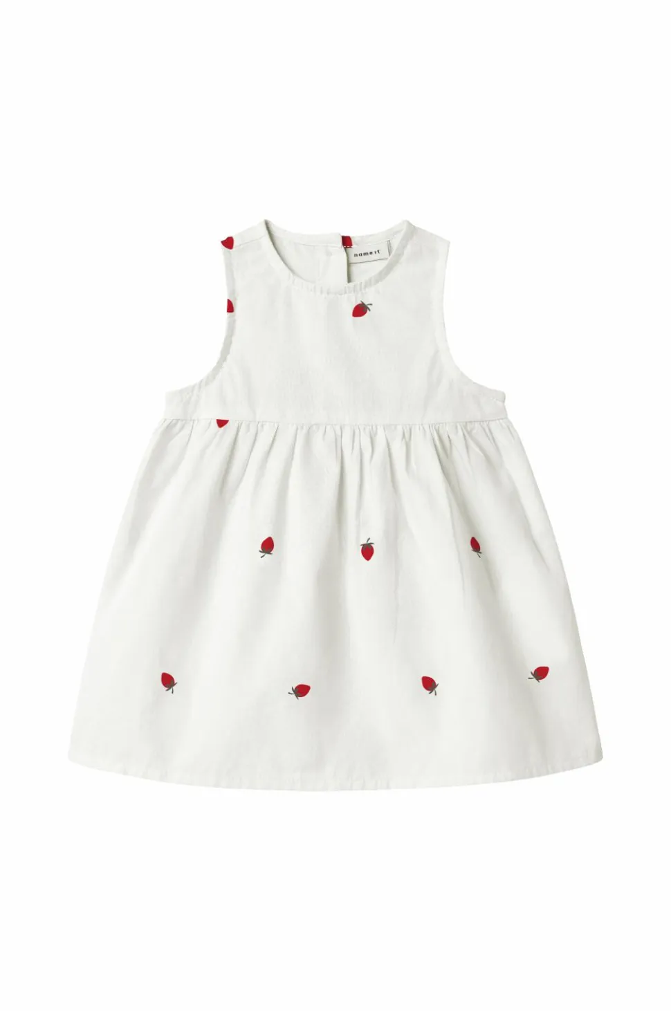 • Ærmeløs kjole i bomuld med broderede jordbær hele vejen rundt