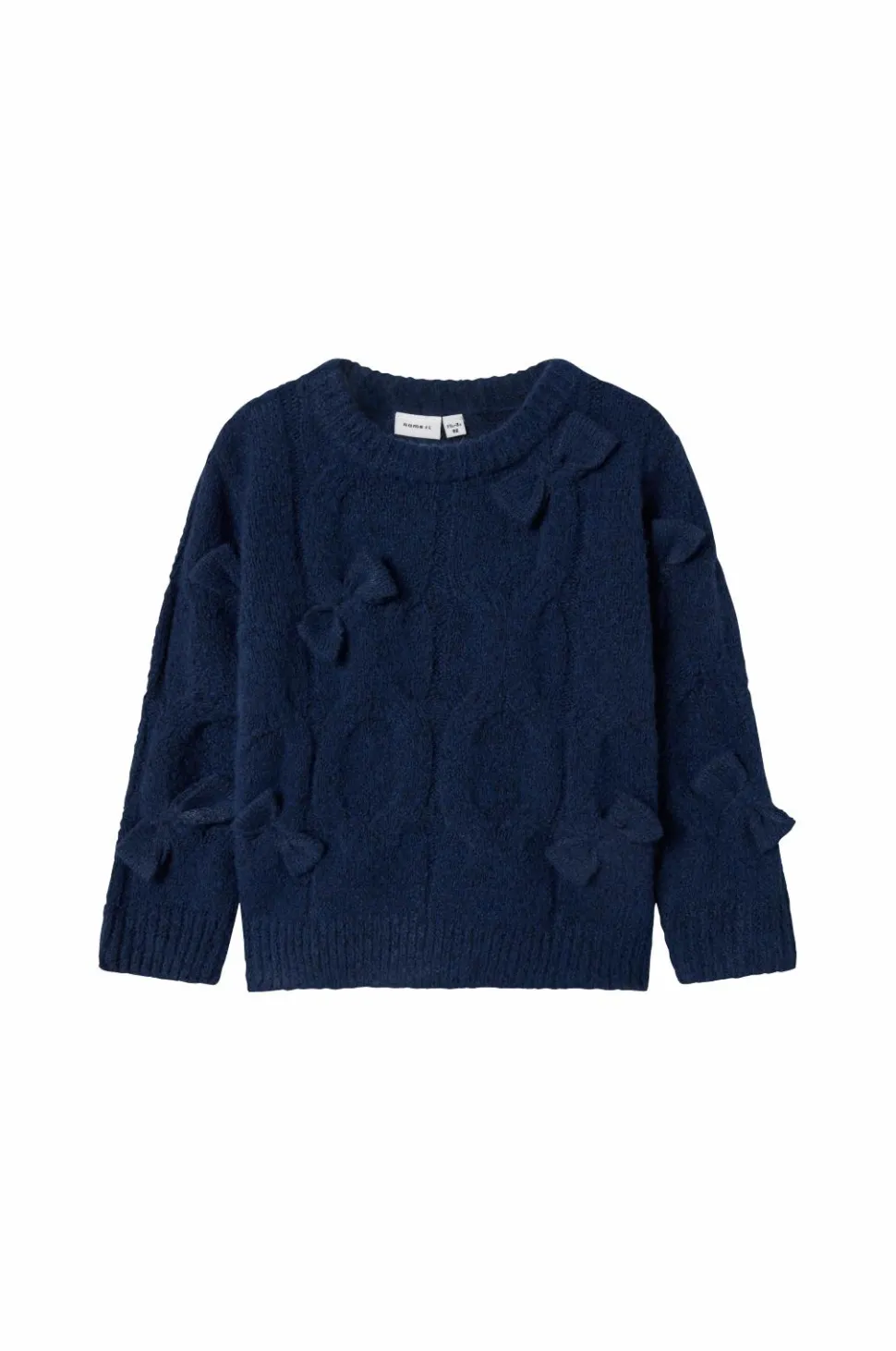 • Blød, mønsterstrikket Pullover med dekorative sløjfer ved fronten