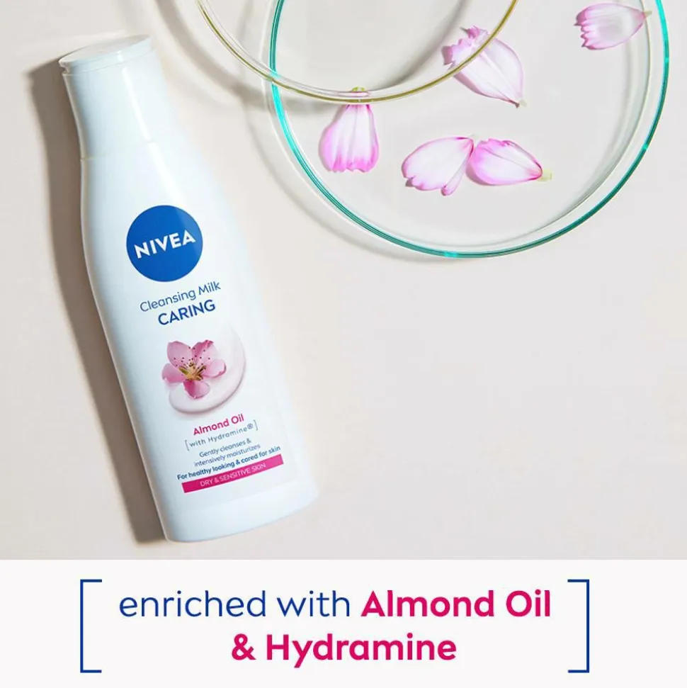 NIVEA Cleansing Milk Caring er en plejende rensemælk. Beriget med mandelolie renser denne ansigtsrens i dybden, fjerner make-up og mascara. Den fjerner tilmed vandfast makeup. Den milde og plejende formel indeholder også hydramin, som virker beroligende og fugtgivende.