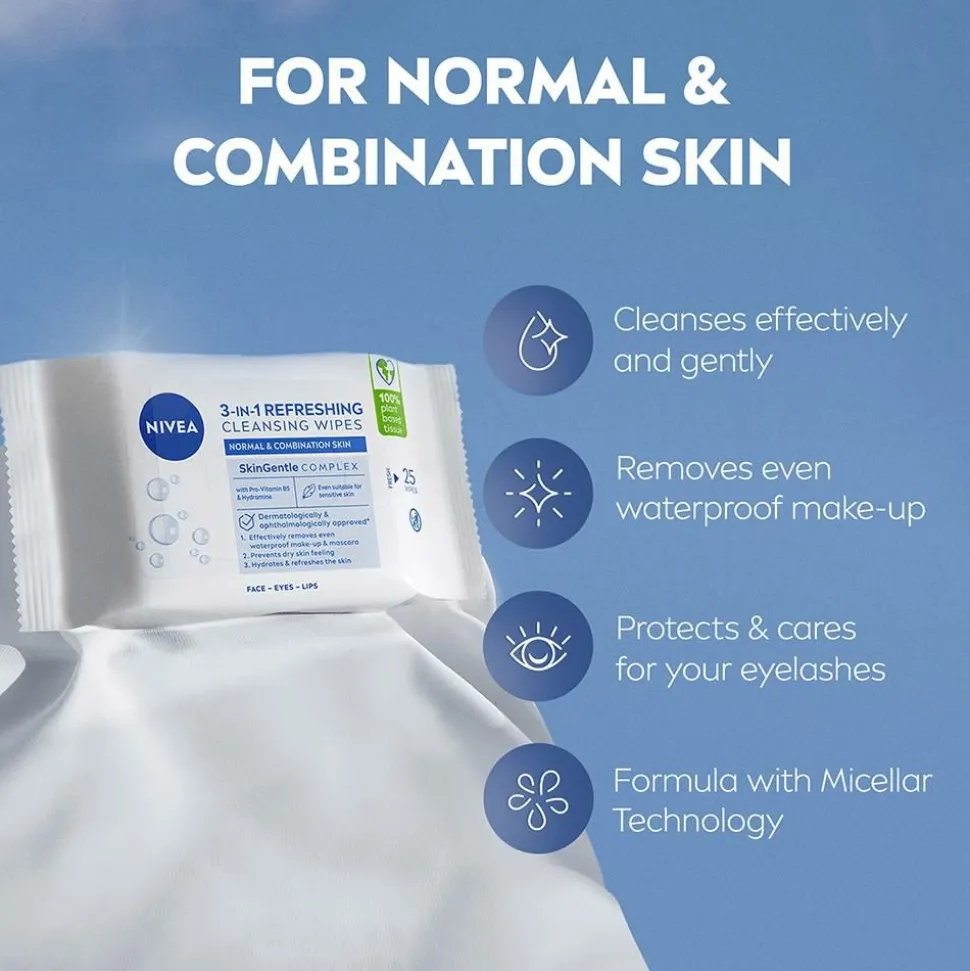 NIVEA Refreshing Cleansing Wipes fjerner effektivt men forsigtigt makeup og vandfast mascara. Mild mod huden og det følsomme område omkring øjnene. Renseservietterne indeholder 0% alkohol og er egnet til normal hud. Ansigtsservietterne er beriget med ekstrakt fra lotusblomst som fugter og opfrisker huden. Perfekt at bruge hjemme eller på farten. Kom ikke wipes i toilettet efter brug.