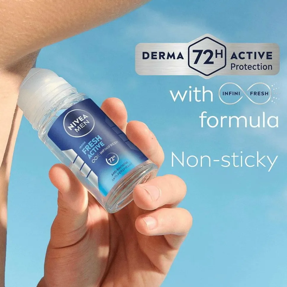 Nivea Men Fresh Active Anti-Perspirant er en pålidelig roll-on-deodorant, der giver dig 72 timers effektiv beskyttelse mod sved og lugt. Denne antiperspirant har en formel med havekstrakt og en frisk, langvarig duft. Antiperspiranten er skånsom mod huden og giver en behagelig, tør følelse, som holder hele dagen. Fresh Active giver Derma 72h Active-beskyttelse, hvilket betyder, at denne antiperspirant arbejder sammen med din hud og giver et pålideligt og stærkt forsvar mod sved og lugt, samtidig med at den er skånsom mod huden. Den indeholder 0 % ethylalkohol, er dermatologisk testet og velegnet til alle hudtyper.