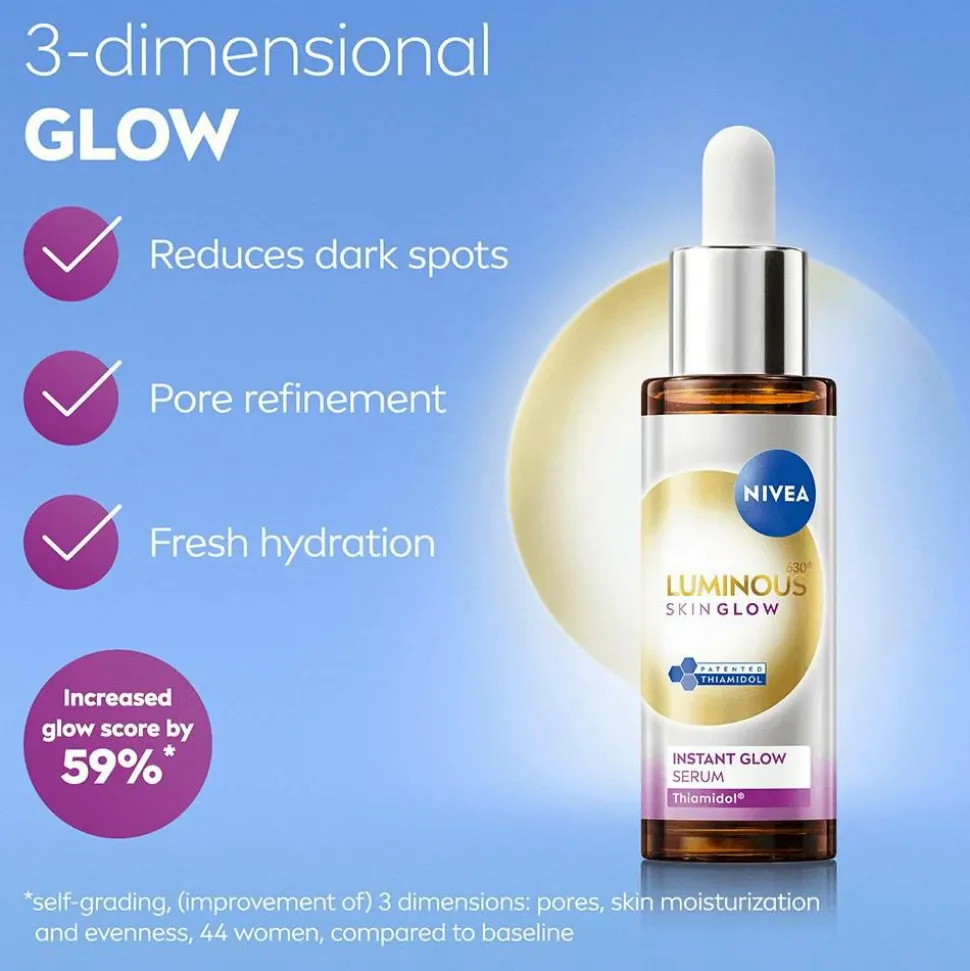 LUMINOUS630® Skin Glow Instant Glow Serum er NIVEAs første produkt, der adresserer de flerdimensionelle aspekter af glød: 1. Evenness: udjævner huden på 3 dage og klinisk dokumenteret reduktion af mørke pletter på 14 dage. 2. Refines Pores : forfiner porerne og udglatter huden inden for 3 dage. 3. Fresh Hydration : Giver øjeblikkelig og langvarig frisk hydrering, der fugter huden i dybden. Oplev 2x mere strålende hud efter 2 uger (selvevaluering, 42 kvinder). Innovativ formel med Thiamidol®, vores effektive ingrediens mod mørke pletter. Niacinamid: kendt for at hjælpe med at reducere overskydende olie på huden og forfine porerne. Aloe Vera: giver øjeblikkelig hydrering.