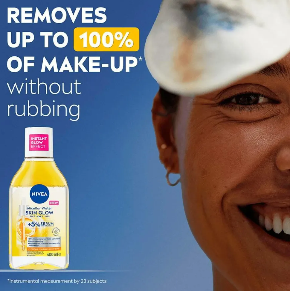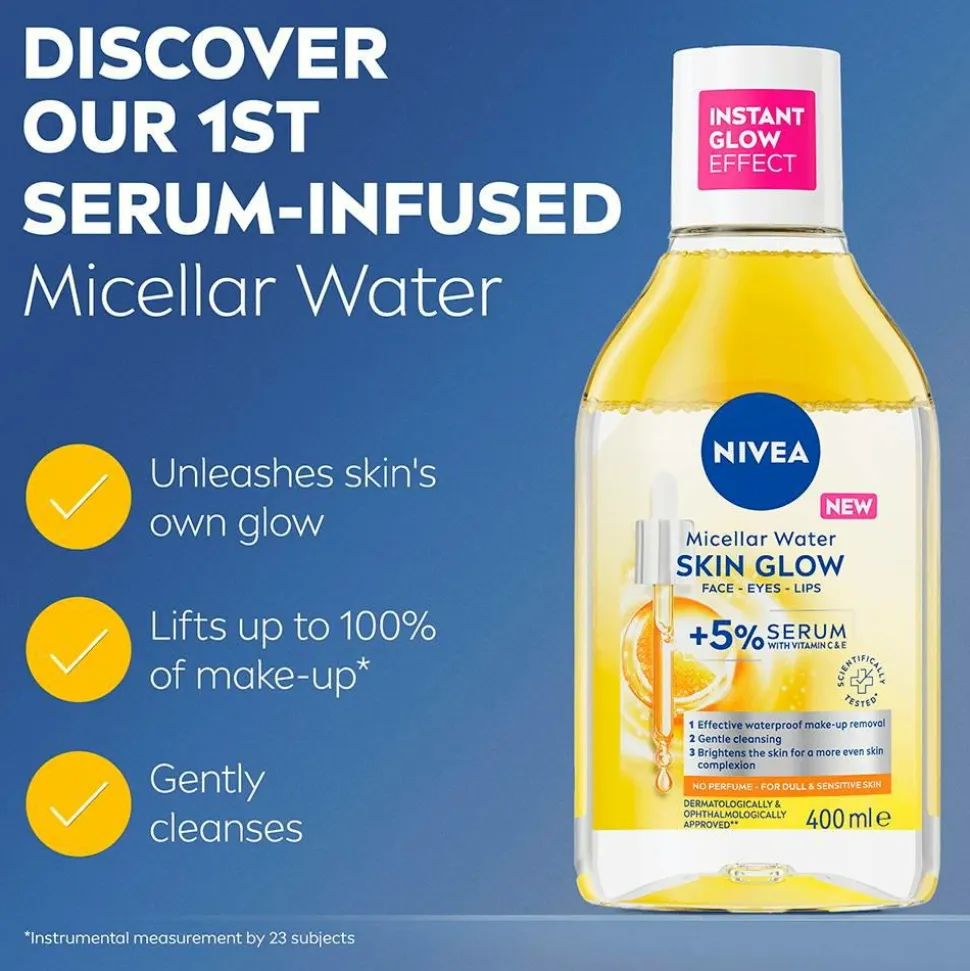 NIVEA Micellar Water Skin Glow er designet til følsom hud, beriget med et aminosyrekompleks og 5% serum, der indeholder vitamin C og E. Denne blide rens fjerner effektivt vandfast makeup, urenheder og snavs uden at efterlade fedtede rester. Den fjerlette påføring kræver ingen gnidning, hvilket gør den meget skånsom mod din hud. Det micellære vand giver energi og fugt, hvilket giver en glattere og mere strålende teint. Den parfumefri formel er både dermatologisk og oftalmologisk testet. Oplev en klinisk dokumenteret lysnende effekt for en glødende, ensartet hudtone med dette innovative micellære vand.