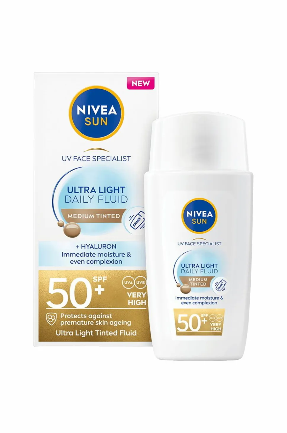 Nivea Sun UV Face Ultra Light Fluid Medium Tinted er en solcreme med en meget høj solbeskyttelsesfaktor Spf 50+, der er specielt udviklet til den følsomme hud i ansigtet. Denne ultralette tonede solcreme beskytter huden mod Uva/Uvb stråler og virkningerne af højenergisk synligt lys (HEV), som f.eks. for tidlig ældning af huden. Den er beriget med hyaluron og antioxidanten Licochalcone A. Denne antioxidant aktiverer hudens egen forsvarsmekanisme og beskytter hudcellerne mod oxidativ stress. Formlen er fri for UV-filtrene Octinoxate, Oxybenzone og Octocrylene. Flasken er fremstillet af 94 % genbrugsplast.