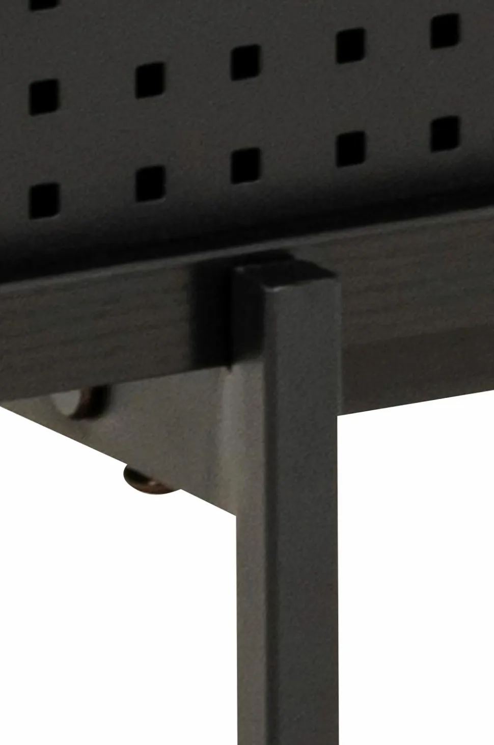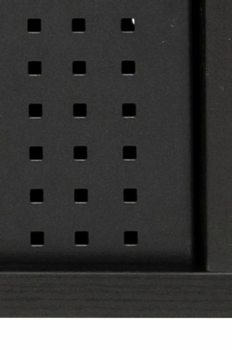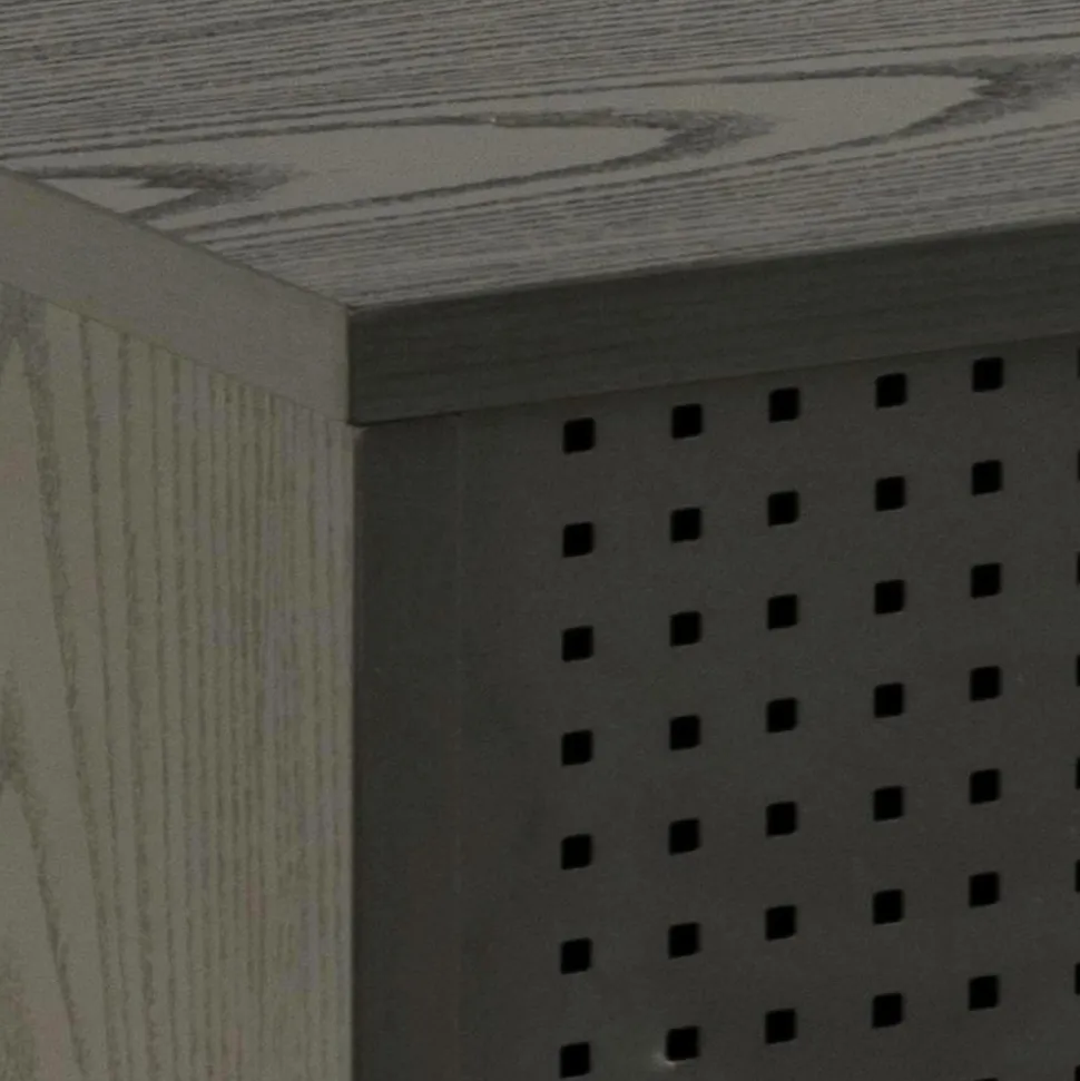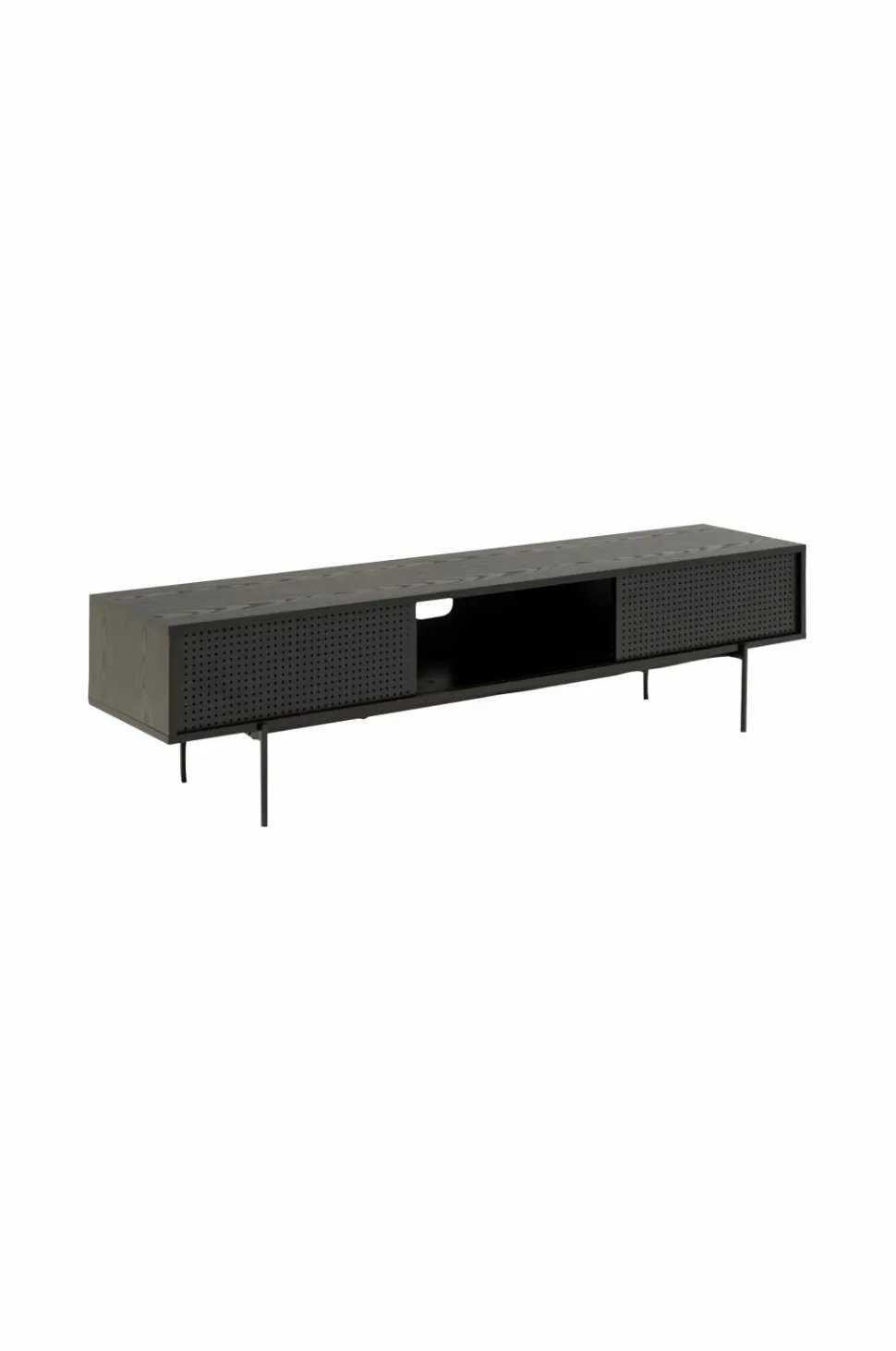Tv-bænk med sort askfinish på MDF, rene linjer og en let form, som er et coolt, moderne tilskud til enhver dagligstue. Tv-bænken er let at tørre ren og står på robuste, pulverlakerede metalben. Skydelåger med mesh-struktur – en gennemtænkt detalje som løfter designet.