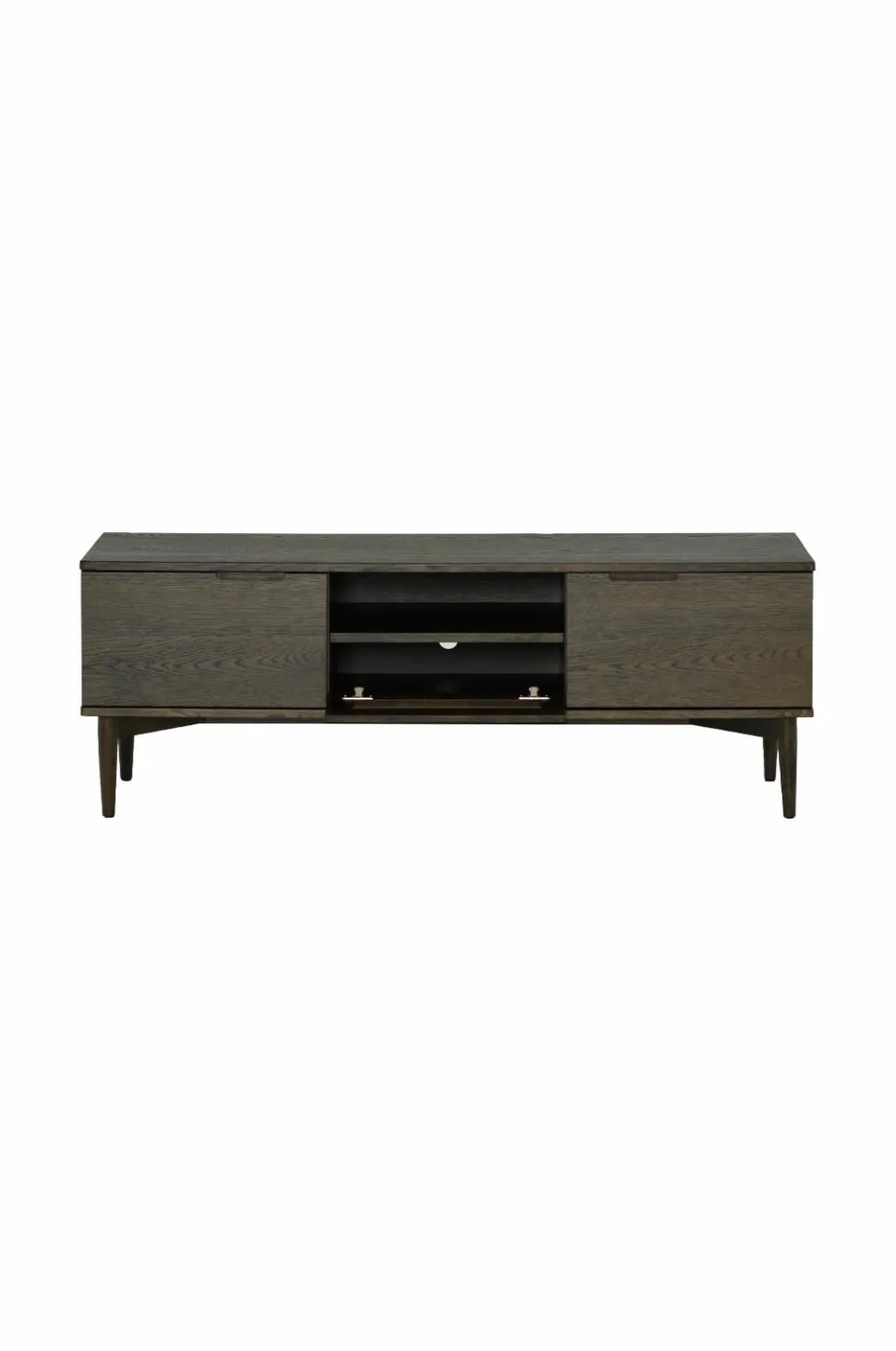 Moderne mediebænk i lakeret eg. 2 opbevaringsskabe, 1 hylde og 1 opbevaring med nedfældelig luge.