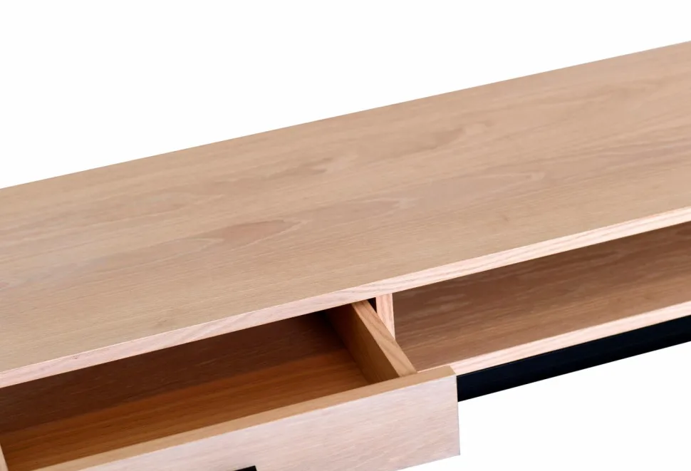 Moderne tv-bænk i lakeret eg og metal.