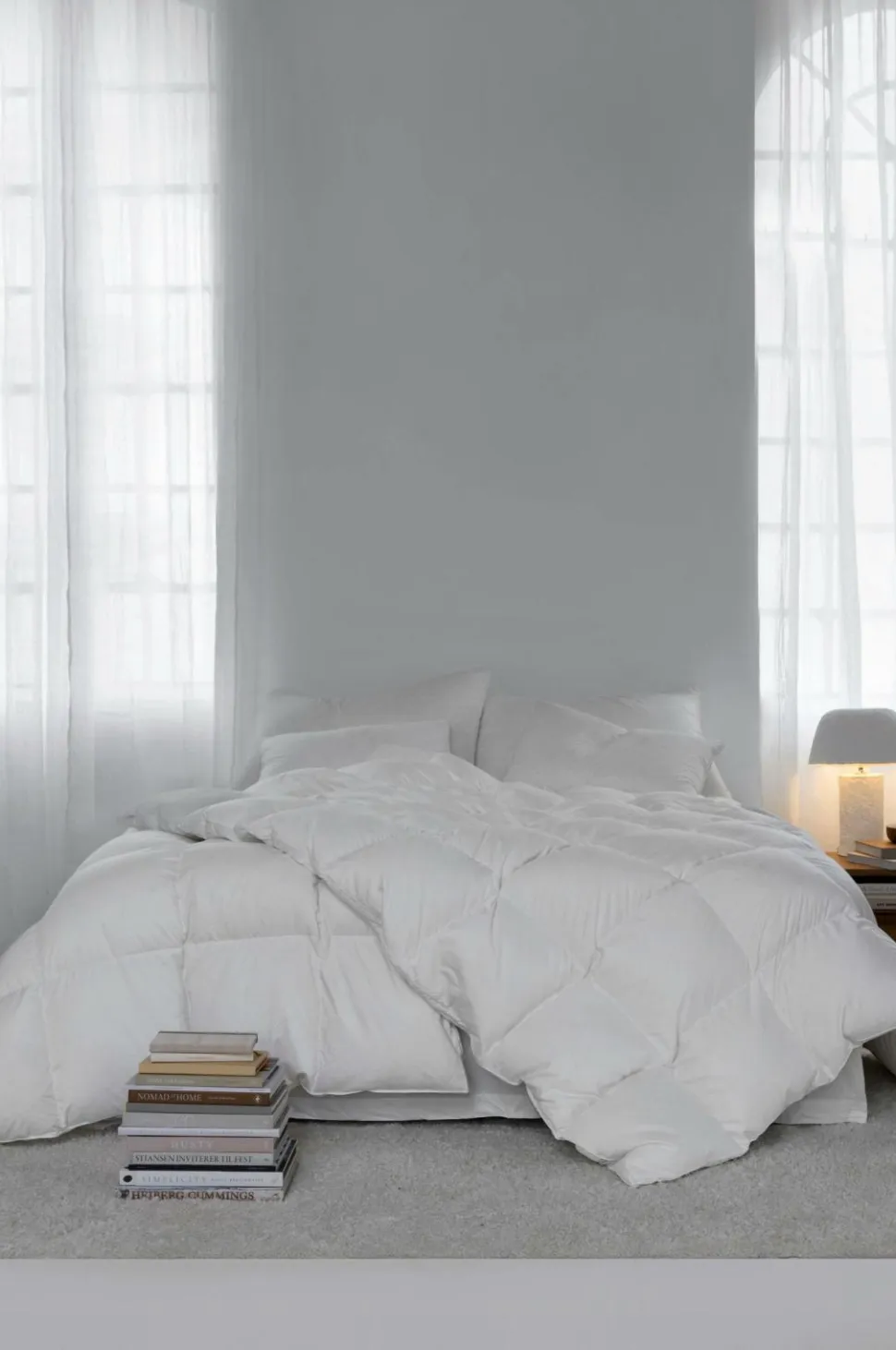 Når kulden rasler uden for vinduet, er denne dyne som en blød omfavnelse, du kan krybe ind i – fyldt med ren europæisk gåsedun. Resultatet er varme, hyggelige nætter med behagelig varme fra top til tå – uden at dynen føles tung. Fyldet af 100 % europæisk gåsedun giver fremragende isolering kombineret med lav vægt og luftighed, så du holdes varm uden at blive overophedet. Betrækket er tæt vævet med en eksklusiv glans og silkeagtig blød overflade, og det bidrager til effektiv åndbarhed for komfort hele natten. Fyldkraft: 825 Cuin.