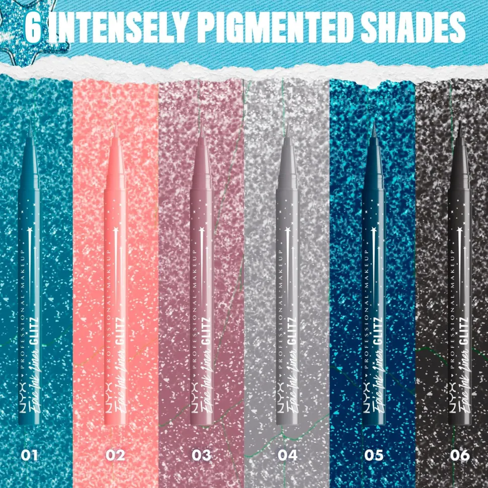 NYX Professional Makeup Epic Ink Glitz Metallic Liquid Eyeliner gir deg episk skimmer. Den tynne ultrapresise pennen gir intens farge og en glitrende metallic finish med bare et sveip. Vannfast, smuldrer ikke og holder i opptil 24 timer. Finnes i 6 denim-inspirerte nyanser.