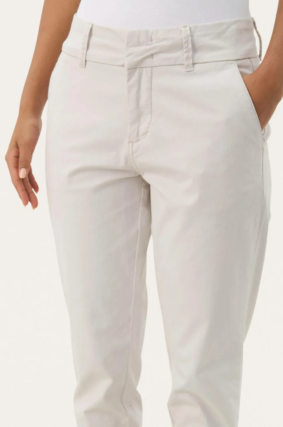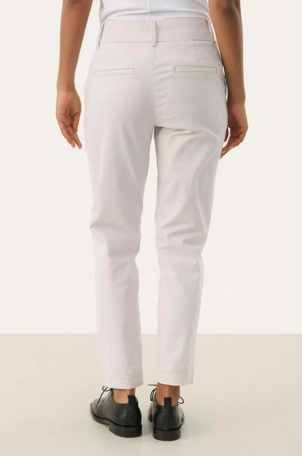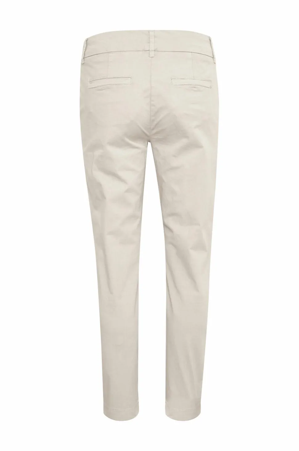 Model med vidde i lårene og bukseben, der bliver smallere nedefter. Bred linning med stropper og skjulte hægter foran samt to skråtskårne forlommer og to indsatte snydelommer bagpå. Indvendig benlængde ca. 72 cm i str. S.