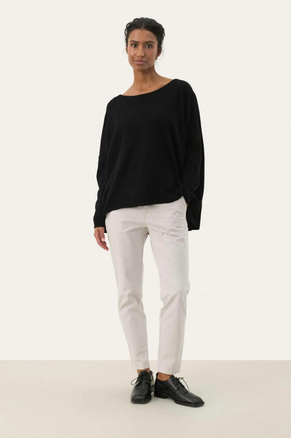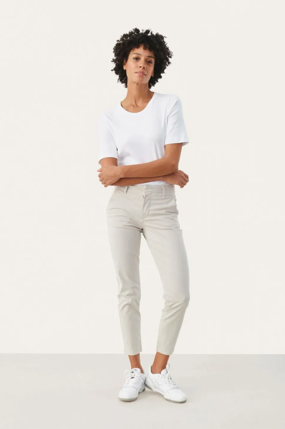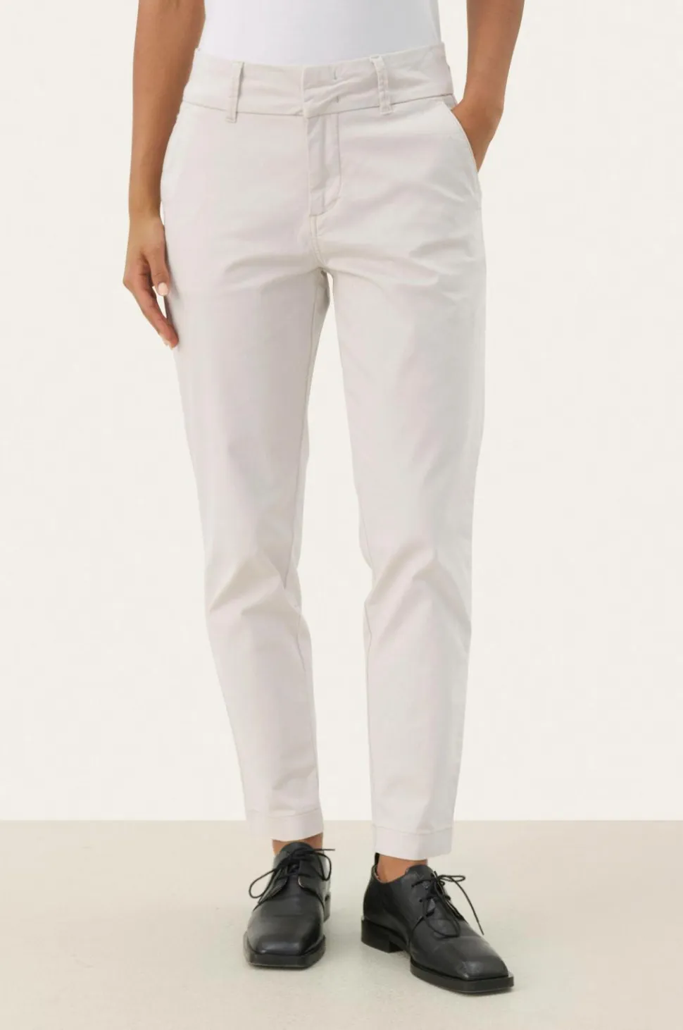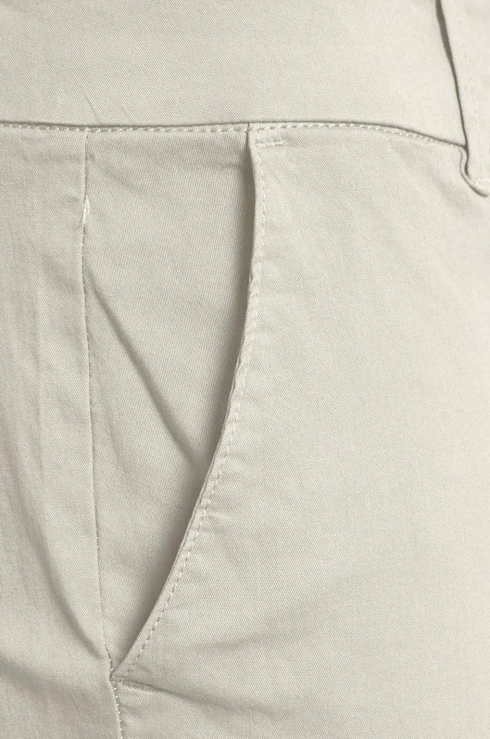 Model med vidde i lårene og bukseben, der bliver smallere nedefter. Bred linning med stropper og skjulte hægter foran samt to skråtskårne forlommer og to indsatte snydelommer bagpå. Indvendig benlængde ca. 72 cm i str. S.