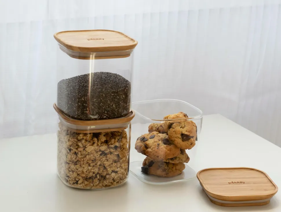Pebblys firkantede glasdåser er perfekte til opbevaring af dine madvarer. Takket være silikoneforseglingen på låget holder de maden lufttæt og bevarer friskhed og smag. Disse opbevaringsdåser i borosilikatglas med bambuslåg er designet til opbevaring af tørre fødevarer som f.eks. morgenmadsprodukter, pasta og ris. Den firkantede form og det stabelbare design gør dem nemme at opbevare på hylderne og er ideelle til at spare plads. Bambusstykkerne tåler ikke opvaskemaskine!