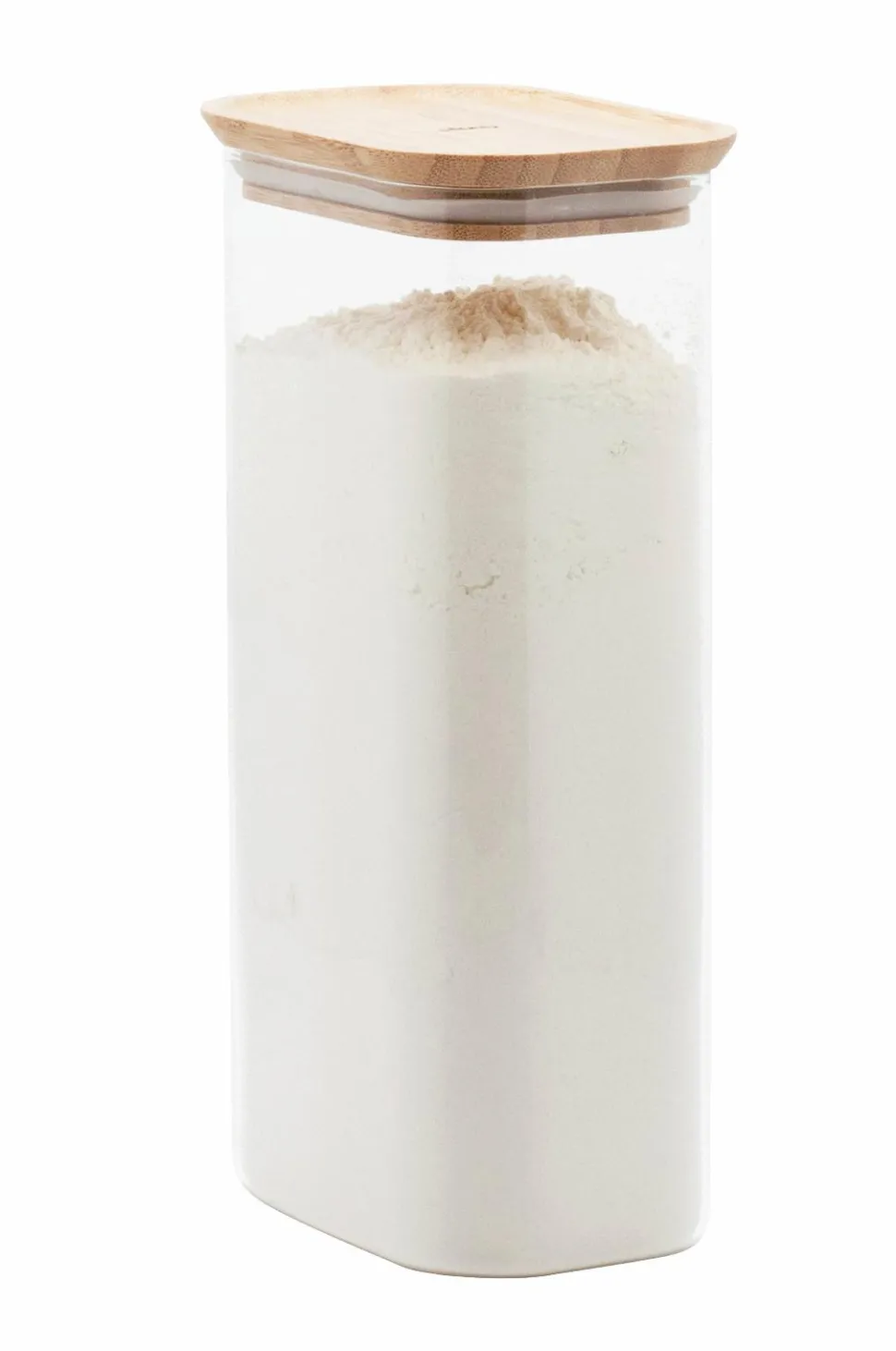 Oplev pebbly’s helt nye høje opbevaringsboks i et smalt rektangulært format, specielt designet til nem håndtering. Dens smarte design gør det nemt at hælde og overføre dine tørre fødevarer, samtidig med at du maksimerer din opbevaringsplads. Bambuslåget giver et varmt touch og en naturlig æstetik til dit køkken og er lufttæt takket være silikonepakningen. Lågets skrå kanter sikrer nem åbning, og den flade overflade betyder, at du kan stable flere dåser for at optimere opbevaringspladsen yderligere.
