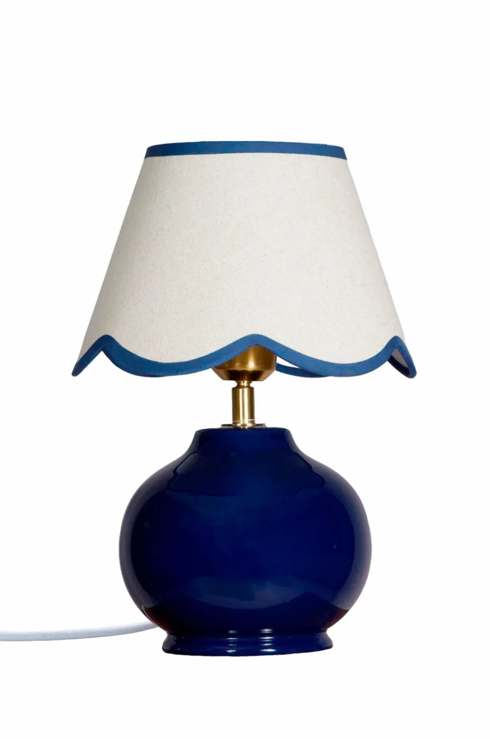 Nell Bordlampen er en komplet lampefod med matchende skærm. Den har en kugleformet keramikfod med en linnedlignende skærm, der har bølget kant med matchende trim. Lampens samlede højde er 35 cm, og den måler 23 cm i dybden og bredden. Plastkablet er 170 cm langt og har en afbryder 30 cm fra lampefoden. E27-fatning. Maksimalt 40w. Ip20. Lyskilde medfølger ikke.