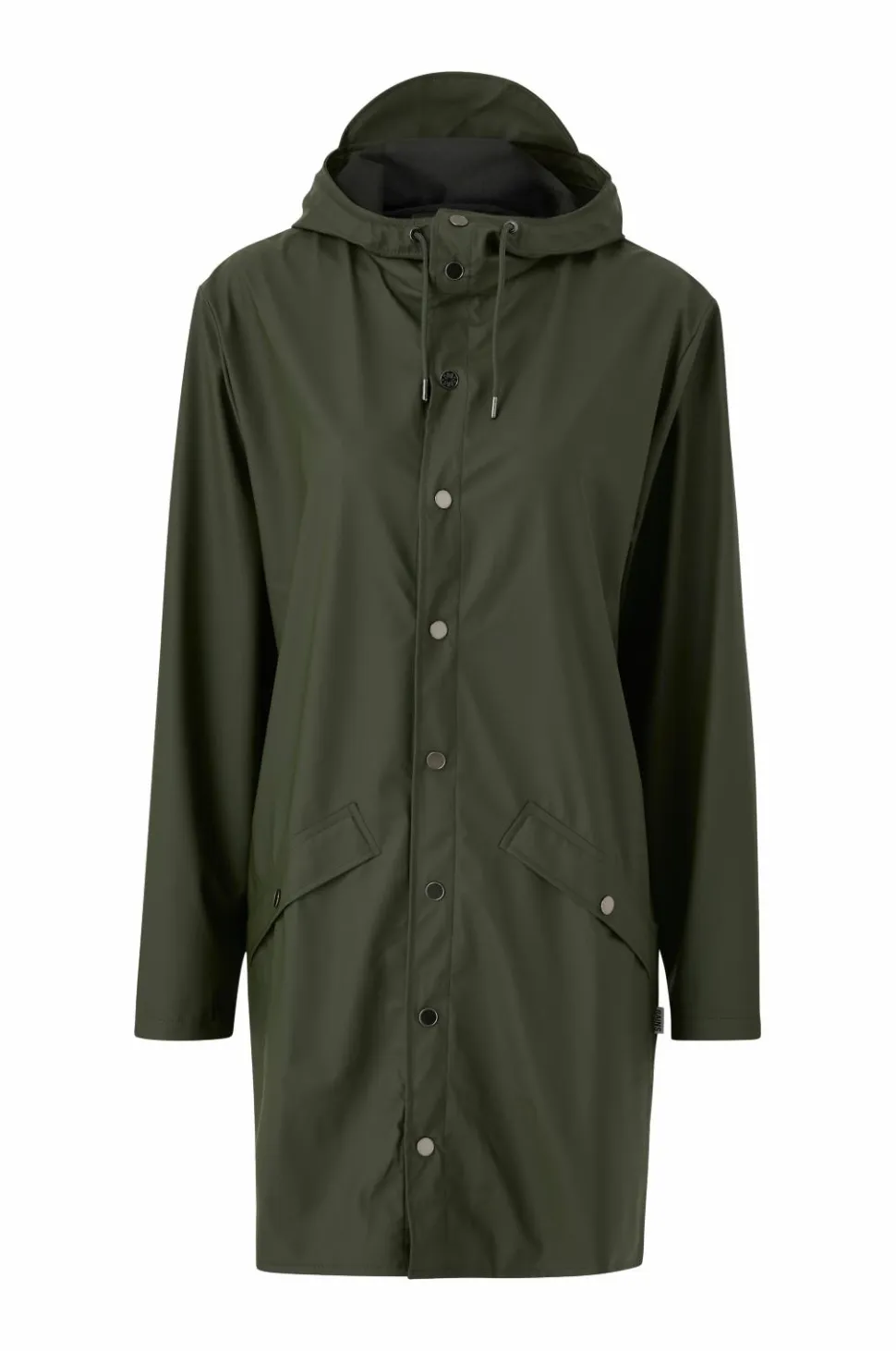 Rains Long Jacket er en klassiker fra Rains. Denne regnjakke i en unisexmodel har et elegant udseende og er syet i et vandafvisende, let stof med en mat finish. Regnjakken har dobbeltsvejsede sidelommer, justerbare manchetter og en slids bagpå.