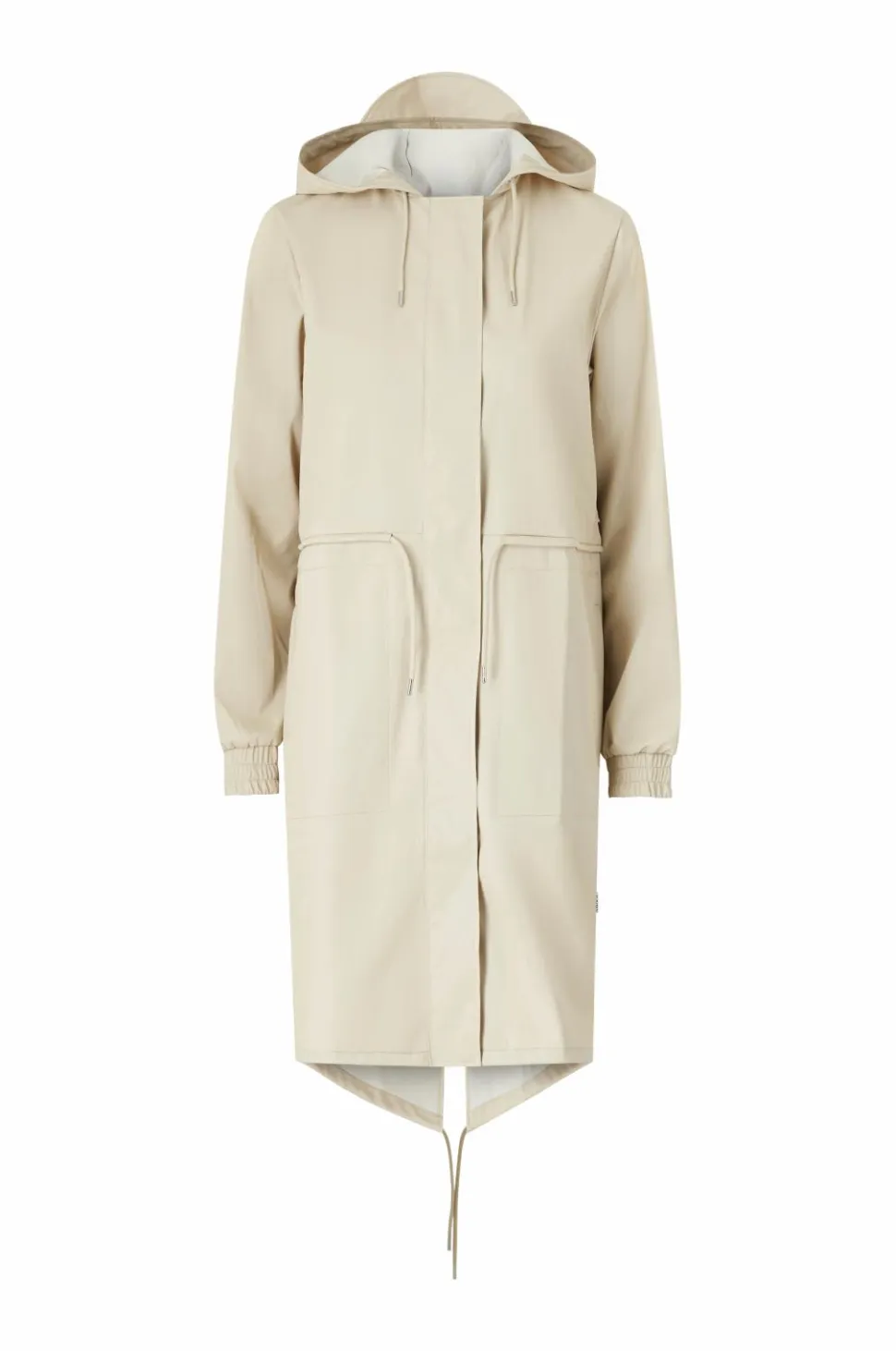 En regnparka fremstillet af vandtæt og stærkt polyesterstof med PU-belægning og forseglede sømme. Den har en let finish med en blød overflade og et pænt fald..