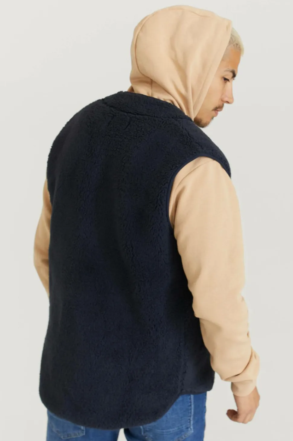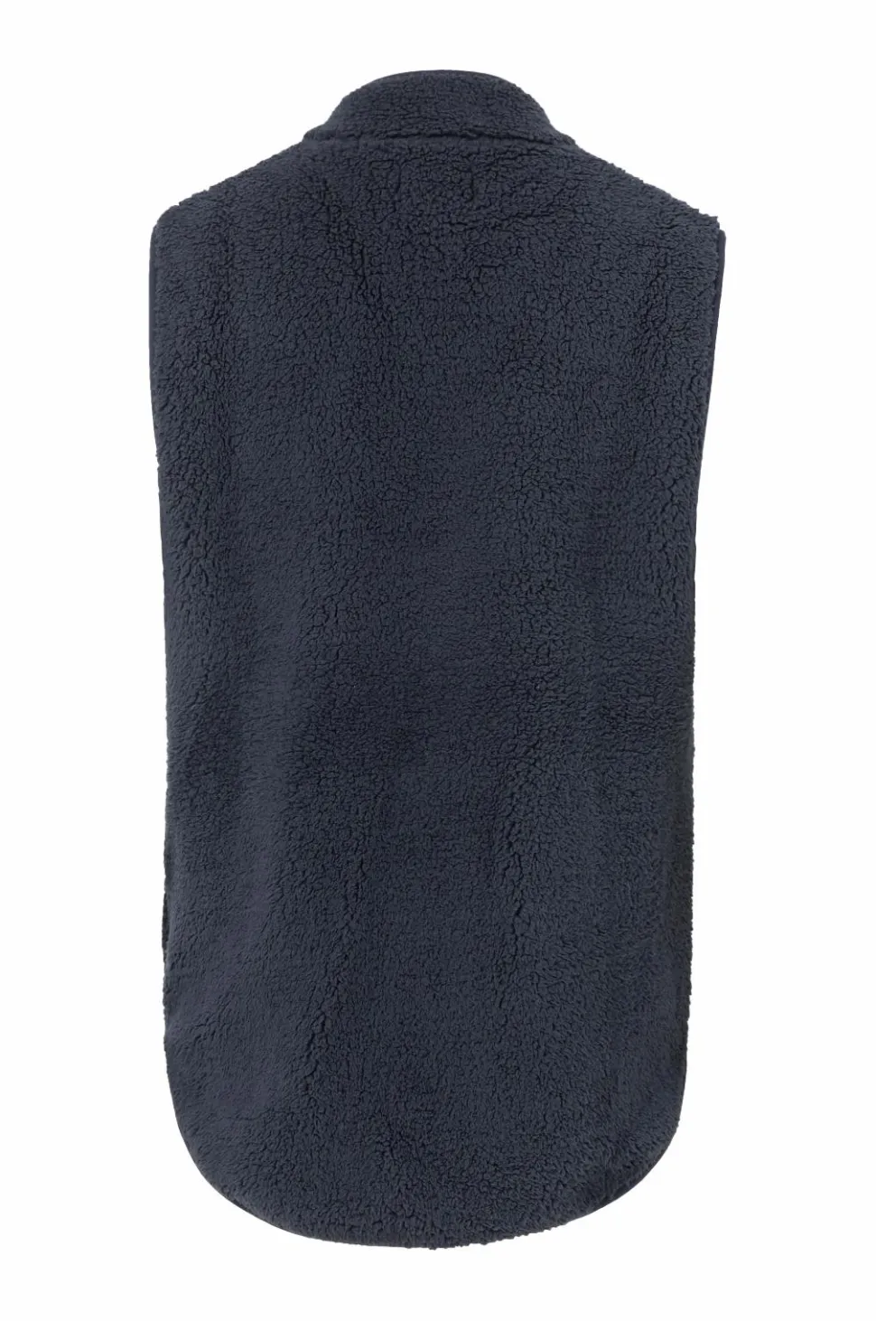 Klassisk fleecevest med lynlås og to lommer med lynlås. Længere bagpå. med afrundet kant forneden.