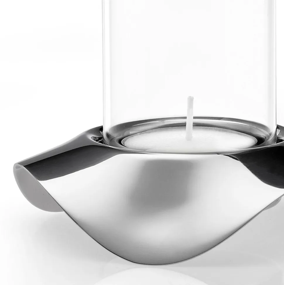 Drift fyrfadslanterne har en flydende, bølgende base, der ligner bølgernes bevægelse. Lysets refleksion på poleret rustfrit stål kaster et magisk lys, uanset hvor det bruges – indendørs eller udendørs. Kan med fordel bruges uden glaskuppel.