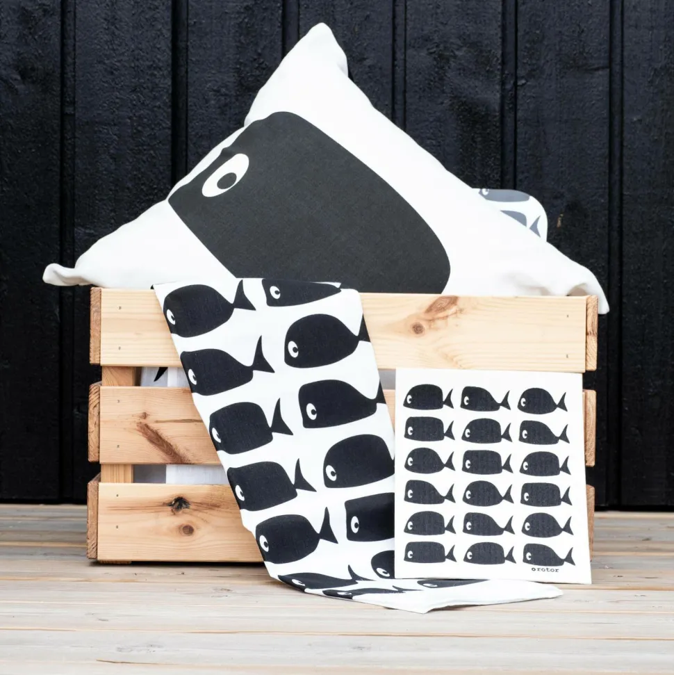 Køkkenhåndklæde med “whale by rotor”-print – en stilfuld og praktisk tilføjelse til ethvert køkken. Lavet til at holde og kan vaskes ved 60°c for nem rengøring. Omhyggeligt udformet i Sölvesborg, Sverige.