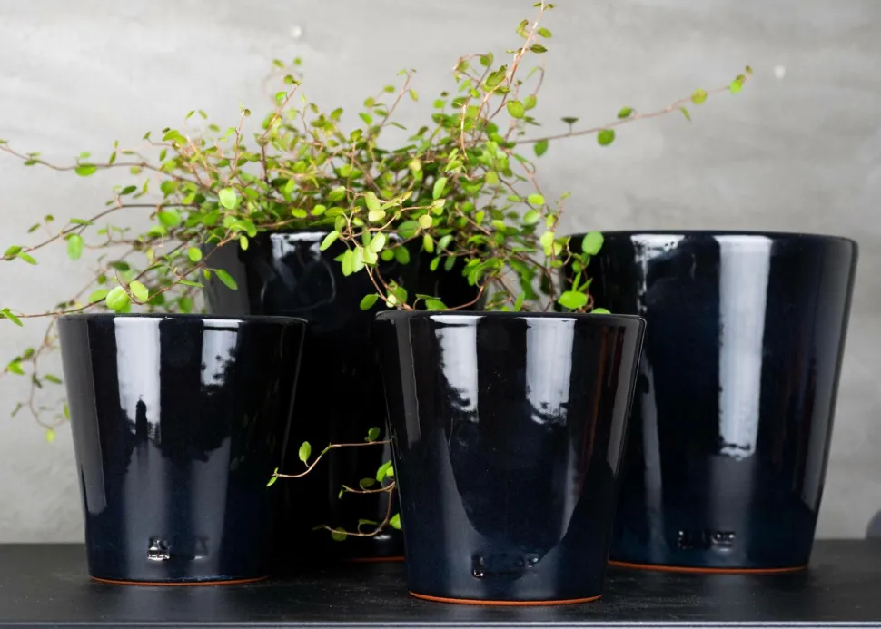 Lille urtepotte “plant by rotor” – en elegant lille potte i sortglaseret lertøj, glaseret både indvendigt og udvendigt. Ydersiden har et diskret “rotor”-reliefstempel i bunden, som giver potten et eksklusivt og unikt udtryk. Perfekt til små planter eller som en dekorativ detalje i dit hjem.