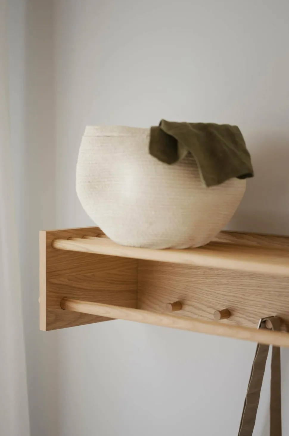 Hillmond-hattehylden i eg skaber en indbydende atmosfære i dit hjem og giver din entré en varm følelse. Knagerækken har 5 knager plus 2 ekstra på siderne, sammen med en bøjlestang til bøjler, hvilket giver optimal opbevaring. Hillmond-kollektionen er synonym med høj kvalitet, smukke trædetaljer og skandinavisk design. Kombinationen af runde former og lige linjer skaber en balance, der er både smuk og funktionel. Du er velkommen til at kombinere knagerækken med andre møbler fra hillmond-kollektionen for en harmonisk stil.