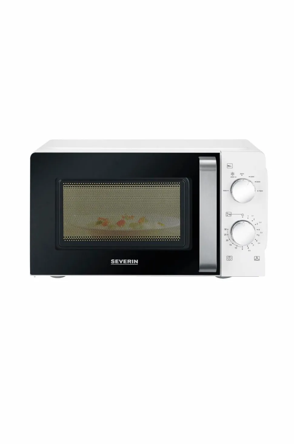 Stilfuld mikrobølgeovn i hvidt design med en effekt på 700W og 17 liters kapacitet.