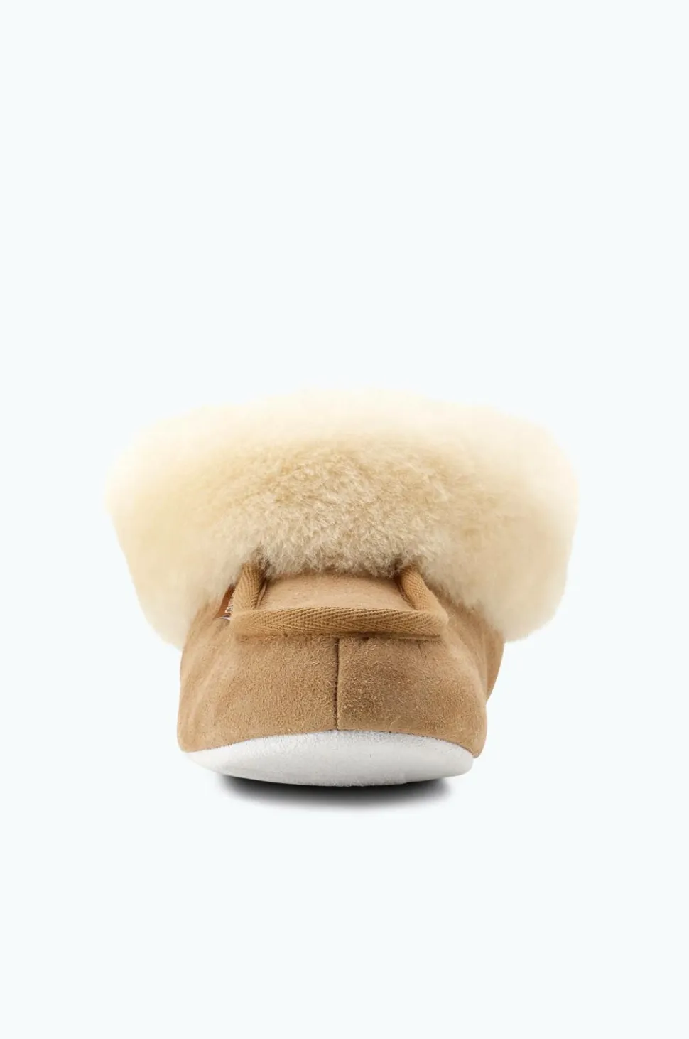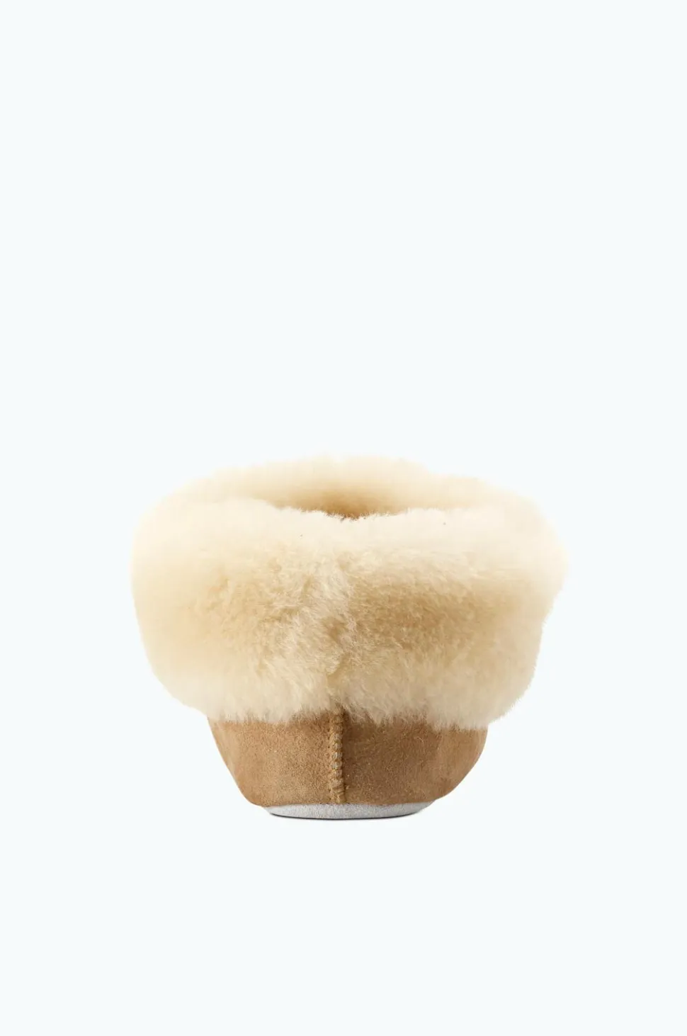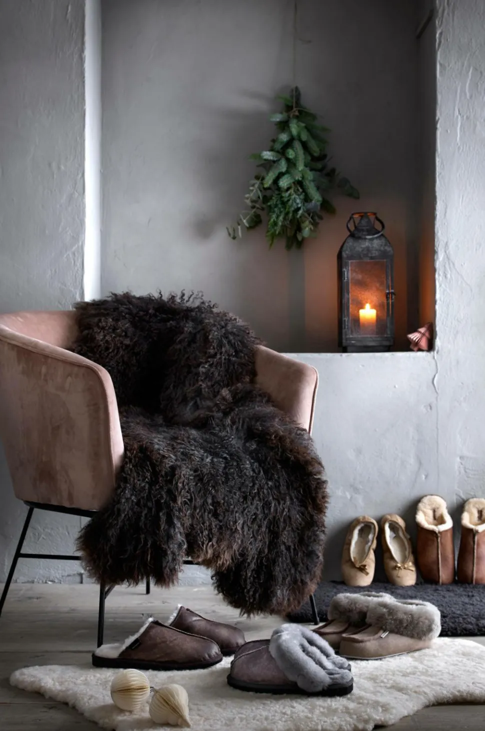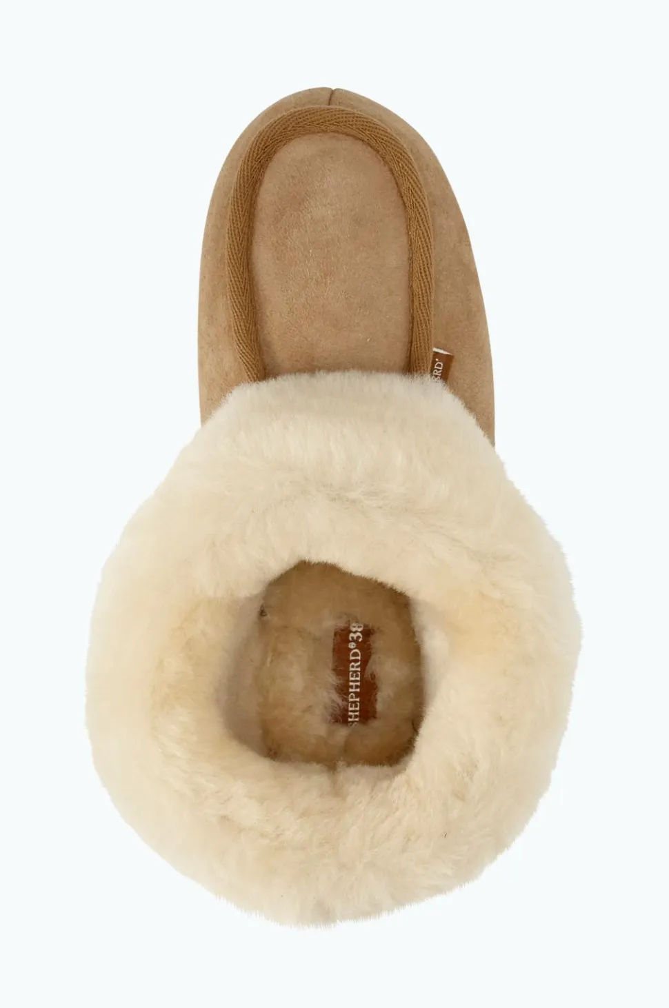 Hjemmesko i lammeskind Moa fra Shepherd er en varm og dejlig hjemmesko i træk-på-model med foldbart skaft. Hjemmeskoene er af ægte lammeuld som varmer og er åndbart. Paspoleret kant i tekstil.