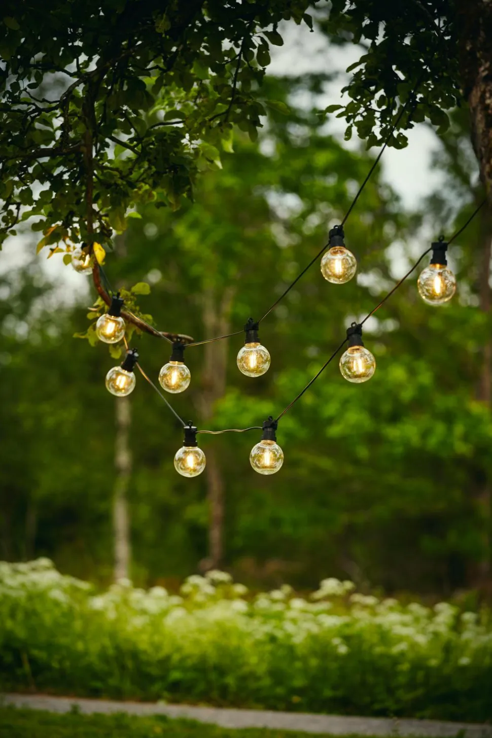 Flot partylyskæde i gummi, med filament, til dekoration både til hverdag og fest. Varmt hvidt lys skaber et skønt lysskær i mørket. Kædens længde er 450 cm, pærerne er 14 cm høje (inkl. “sokkel”) diameter 8 cm. Tilslutningskablet er sort med en længde på 500 cm. Kæden kan bruges både indendørs og udendørs. Transformer medfølger. Forventet levetid 10000 t. 10 integrerede led-lyskilder medfølger (ikke udskiftelige). Pærens effekt (W):0,26. IP44. Filamentet er udformet til at ligne trådene i en klassisk glødepære, således at dit armatur får et effektfuldt look.
