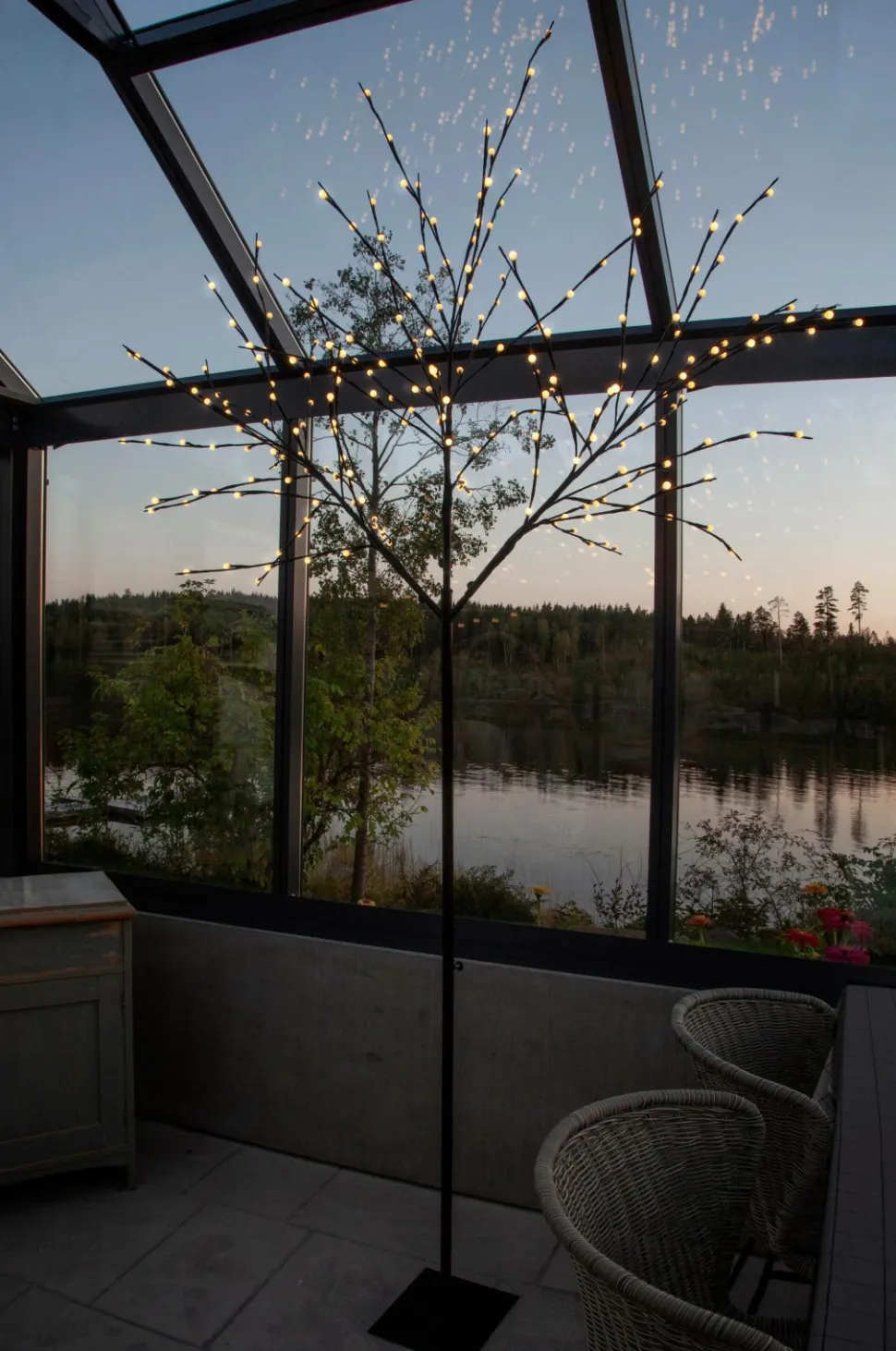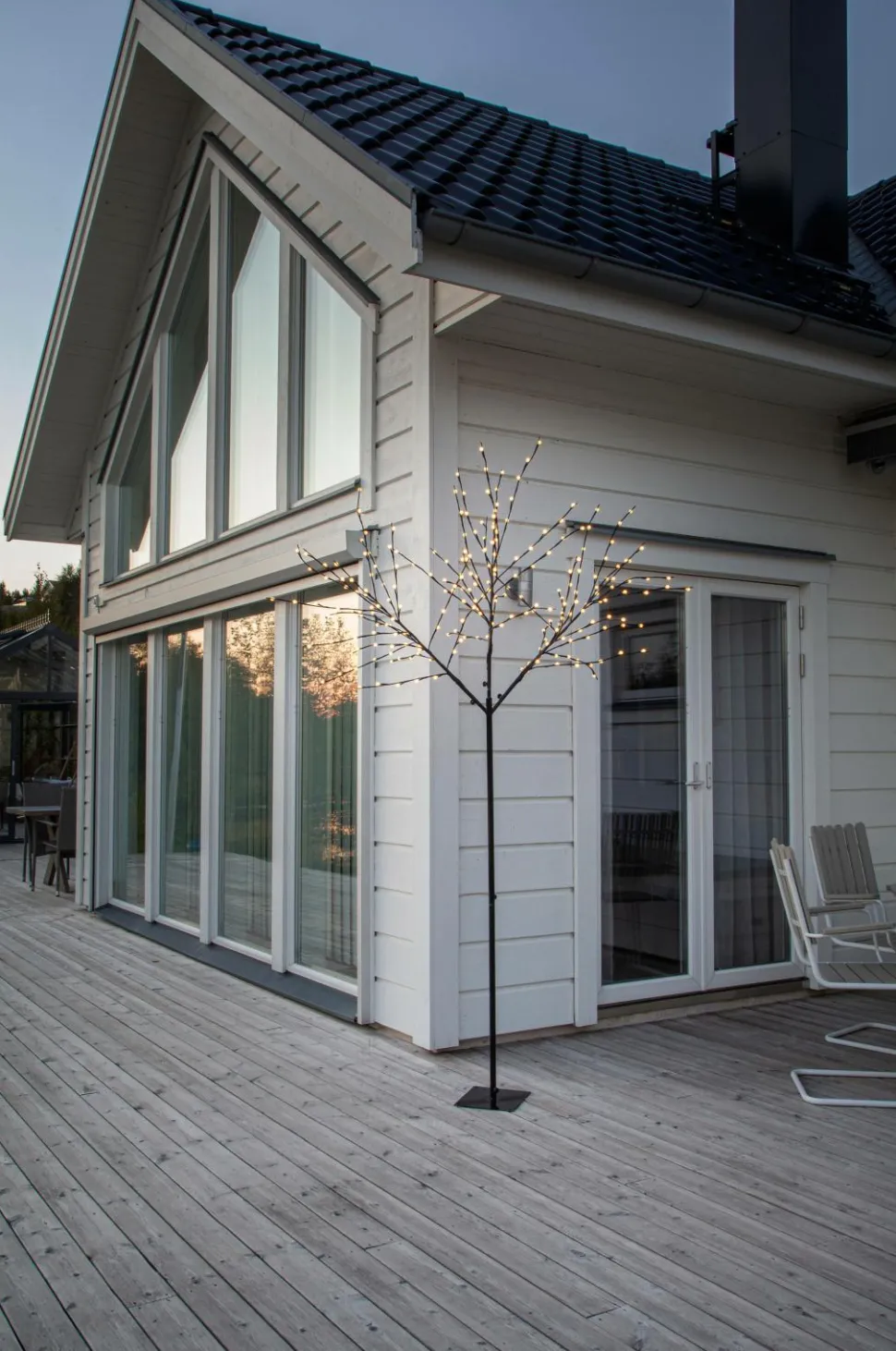 Udendørs dekoration i form af et træ, 250 cm højt. Sort stamme og grene med hvide små kugler, der dækker hvert lyspunkt. 240 varmhvide lysdioder, der giver et stemningsfuldt skær og er lige så gode til jul som året rundt. Der medfølger monteringsvejledning og jordspyd til nem montering og fastgørelse. Timerfunktion, 6 timer tændt og 18 timer slukket, i transformeren.
