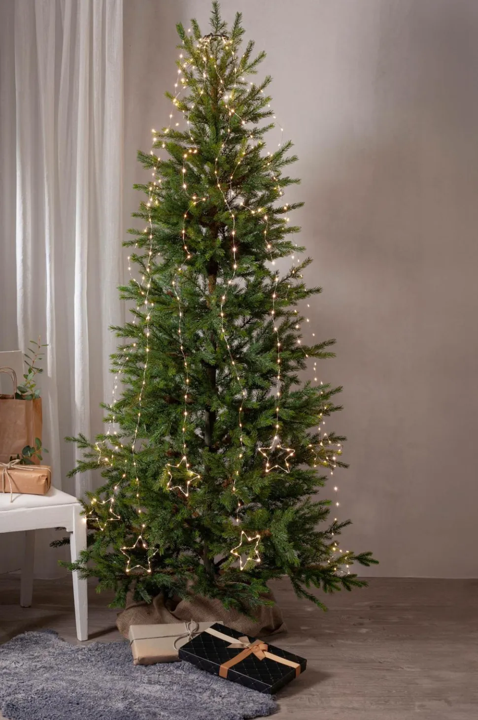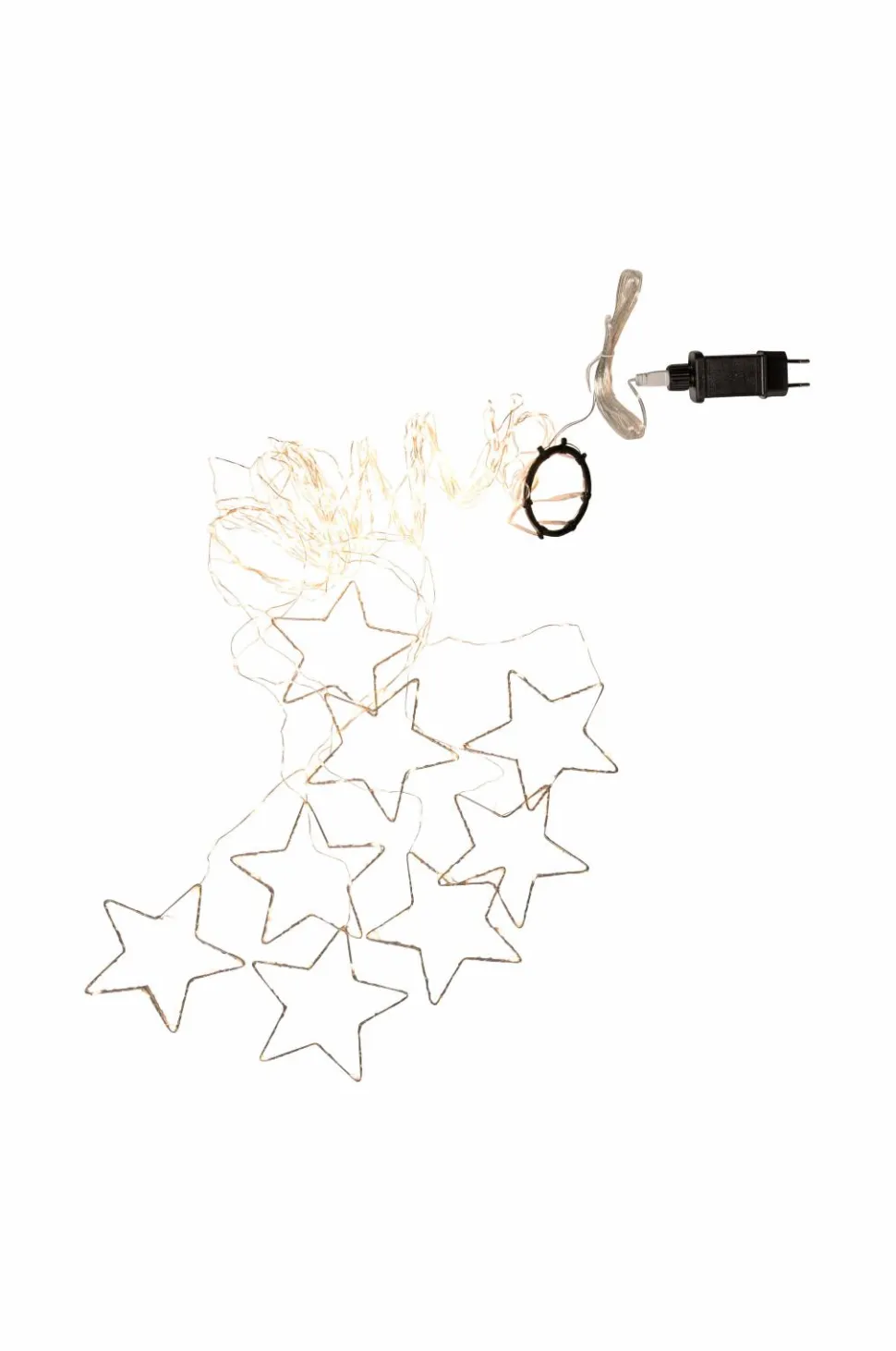 Juletræslyskæde med varmhvide dugdråber. 8 strenge med en dekorativ metalstjerne i bunden af hver streng, strengene har to længder, 1,6 og 2 m. I alt 384 lyspunkter, der giver en vidunderlig glød i juletræet. Ip20-klassificeret transformer til indendørs brug.