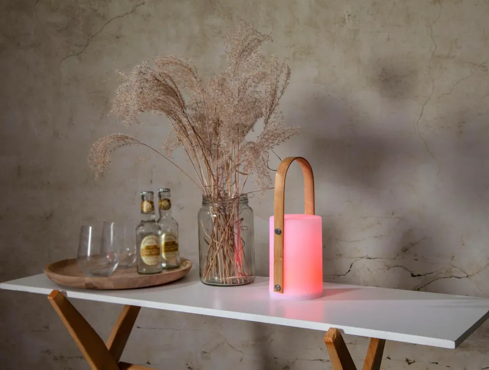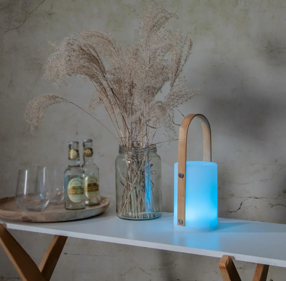 Flot bærbar lanterne med flere farvevalg, varmhvid eller rgb. Vælg den ønskede farve ved at trykke på knappen i bunden. Tryk i 3 sekunder for at slukke lanternen. Genopladeligt batteri, som du oplader med det medfølgende usb c-kabel. Til både indendørs og udendørs brug. Let at bære rundt på og giver en behagelig ekstra belysning på dejlige sommeraftener i haven, på altanen eller på stranden. Højde: 26 cm.