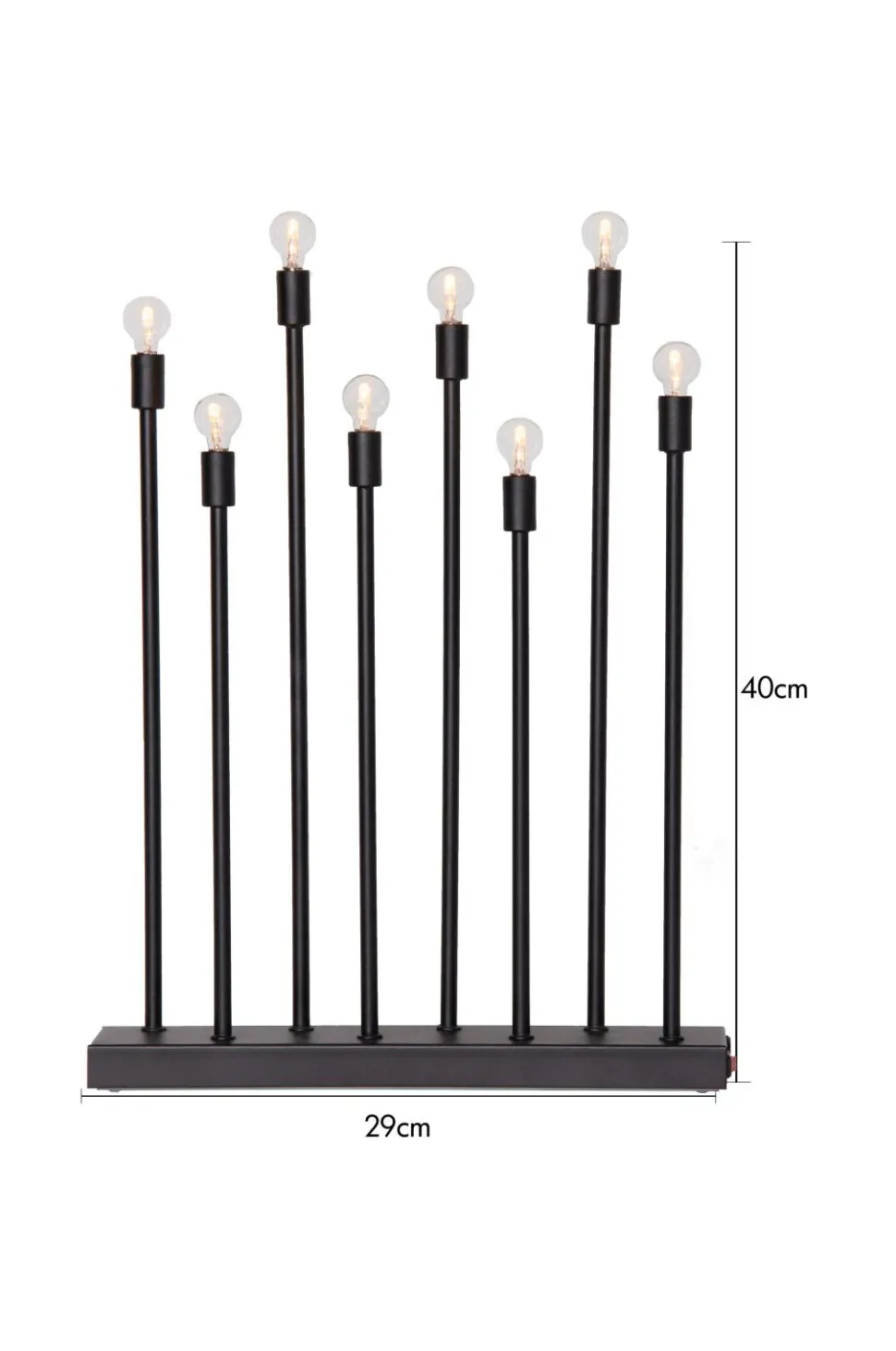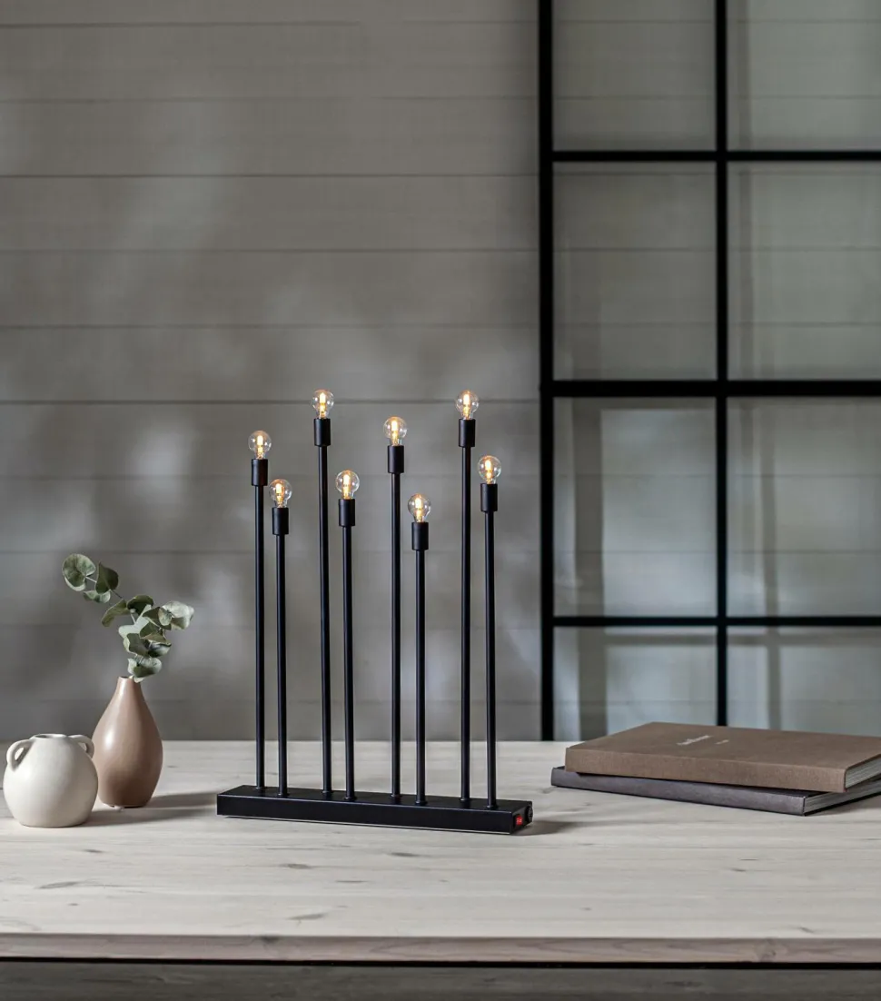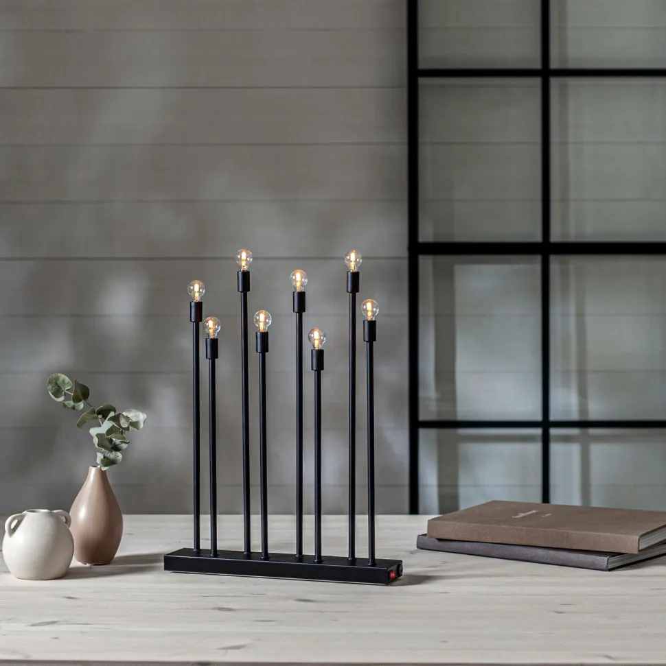 Genopladelig moderne lysestage i metal med runde led-lys, der giver et stemningsfuldt lys. Passer godt i et vindue eller på en bænk eller hvorfor ikke på et bord? Den er nem at placere, da der ikke kræves en stikkontakt i nærheden.