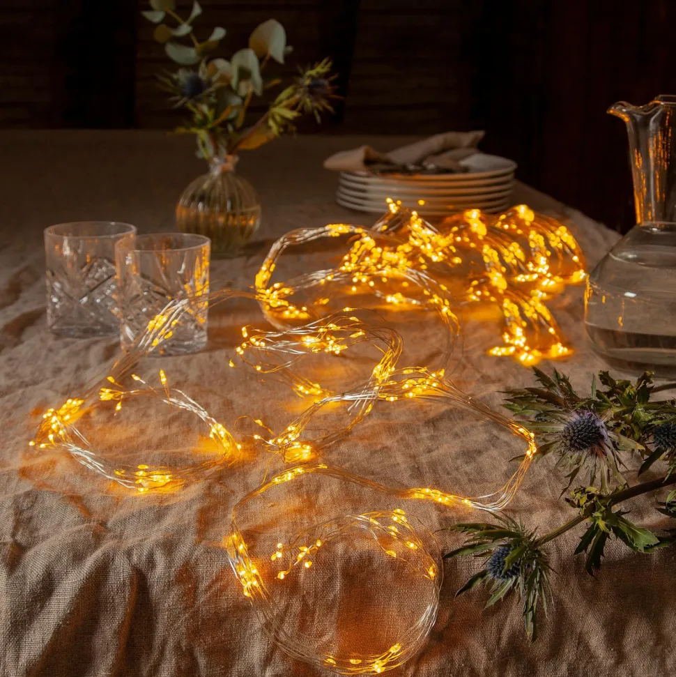 Smuk lyskæde med 720 led dugdråber fordelt på 36 strenge. Lyskædens kabel er sølvfarvet, og lysene har et varmt hvidt skær. Farvetemperaturen er 2200k. Længden på tilslutningskablet er 300 cm.