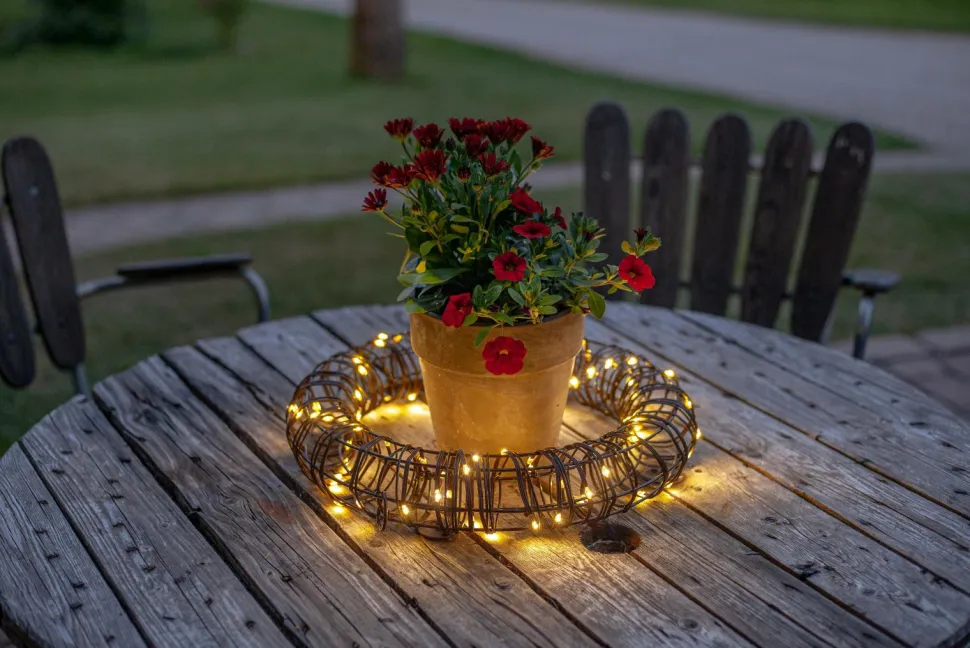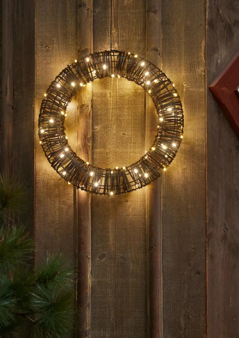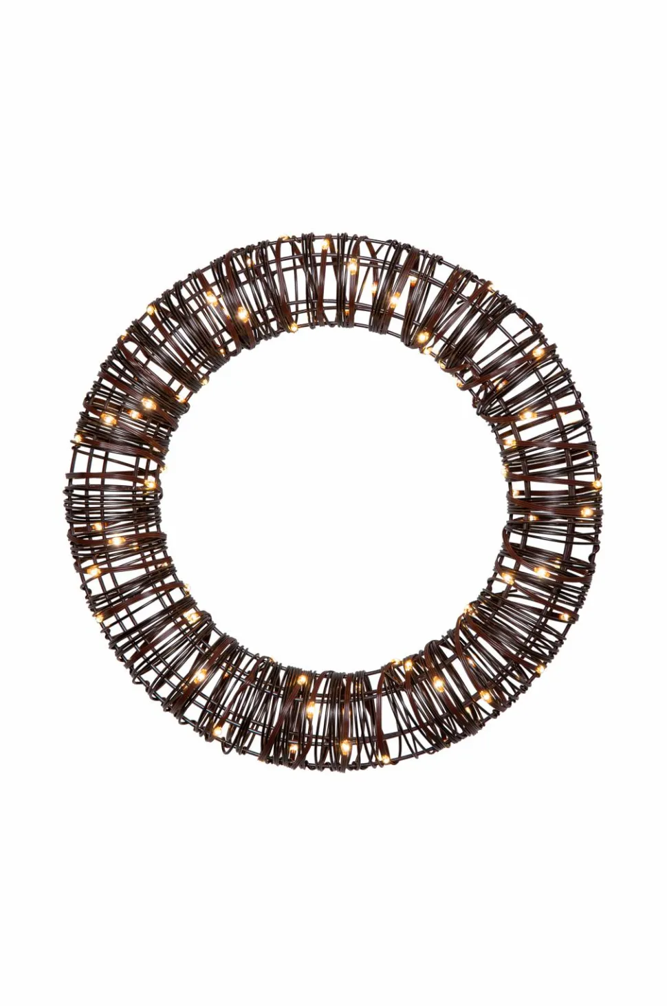40 cm krans i metalramme med brun kunstrotting, 80 varmhvide lysdioder. Dekorer din have eller dit hjem. Velegnet til både inde og ude.