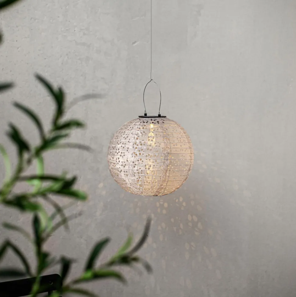 Solcellelanternen Festa er lavet af polyester med et hulmønster, der skaber et smukt skyggespil, når den lyser i mørket. Festa bliver en smuk dekoration både i haven, på terrassen eller altanen. Placer lanternen, hvor solen kan nå panelet i løbet af dagen for at få den ultimative opladning af det medfølgende batteri.
