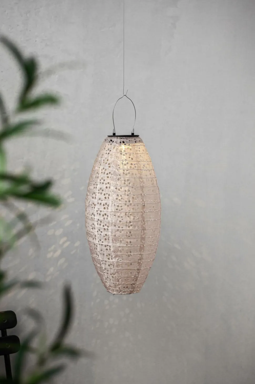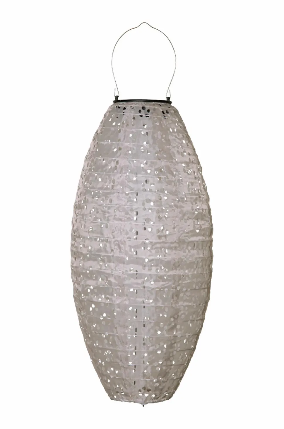 Solcellelanternen Festa er lavet af polyester med et hulmønster, der skaber et smukt skyggespil, når den lyser i mørket. Festa bliver en smuk dekoration både i haven, på terrassen eller altanen. Placer lanternen, hvor solen kan nå panelet i løbet af dagen for at få den ultimative opladning af det medfølgende batteri.
