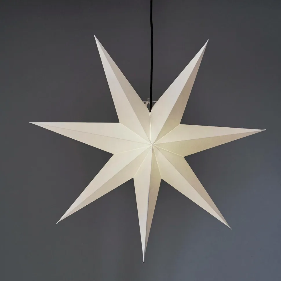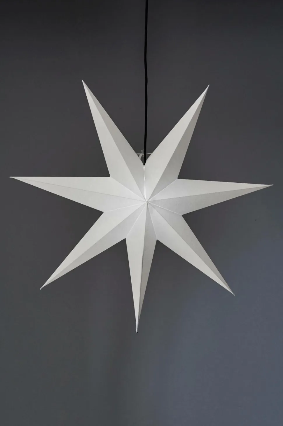 Hvid papirstjerne med sort tekstilkabel. Elegant stjerne til at dekorere med i hjemmet. Stjernen har plads til én lyskilde. Dette produkt er fsc®-certificeret. Længden på tilslutningskablet er 350 cm med e14-stik. Stjernen er 70 cm i diameter.