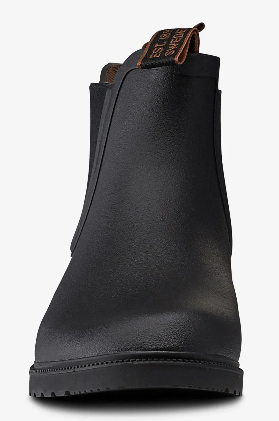 Gummistøvle Chelsea Classic fra Tretorn har et lavt skaft med lynlåsindsats foroven på begge sider af skaftet, hvilket gør skaftvidden noget fleksibel. Vandtæt i naturgummi. Udtagelig, stofbeklædt indersål og grebssikker, mønstret gummiydersål. Vævet træk på-strop både foran og bagpå skaftet. Skafthøjde: ca. 12 cm.