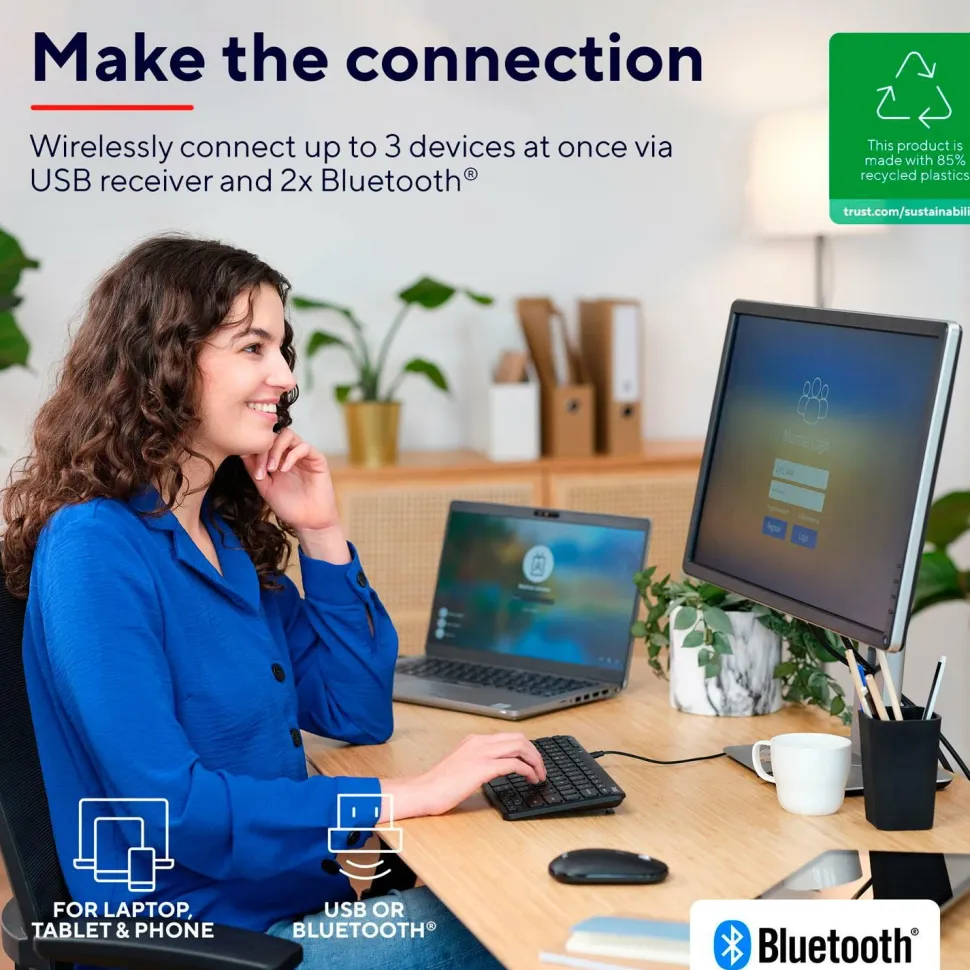 • Opretter forbindelse til flere enheder: 3 via USB-modtager og Bluetooth.