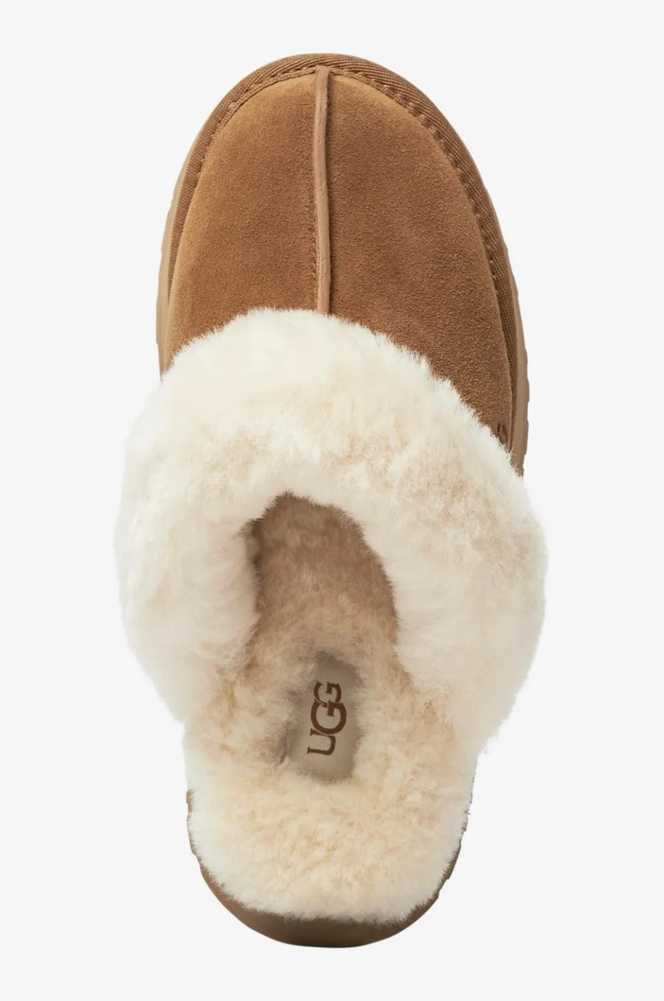 Tøfler med overdel i ruskind. For og fodseng i blød fårepels. Høj sål i EVA. Sålhøjde ca. 2,5 cm.