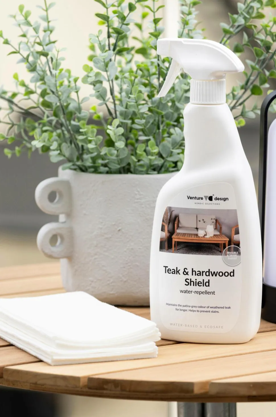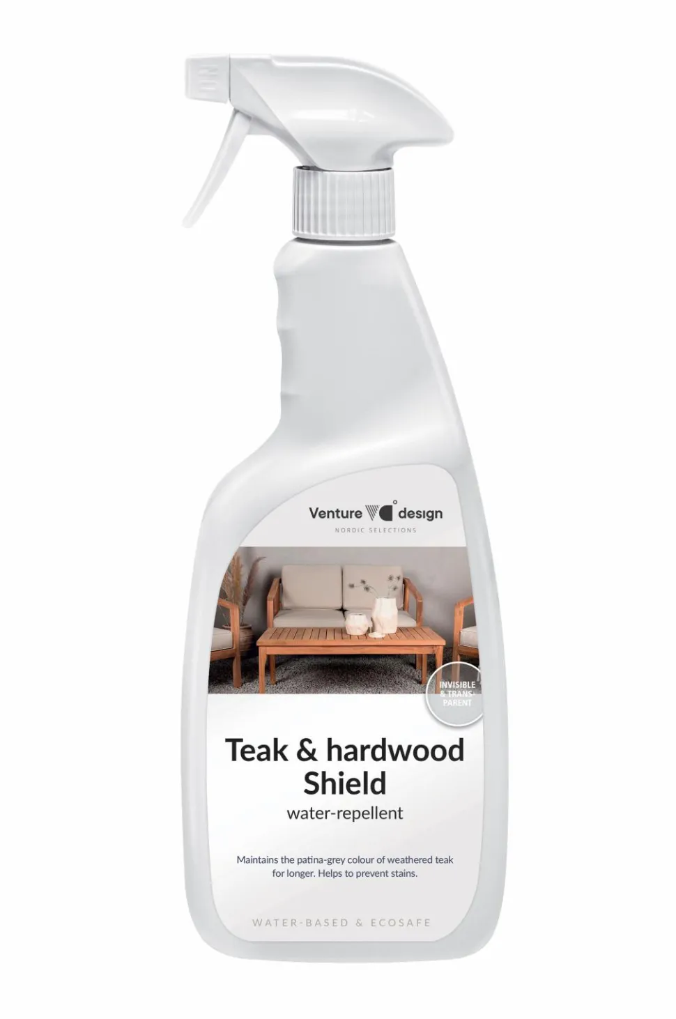 Havemøbler udsættes for stor belastning under sæsonens forskellige vejr- og temperaturændringer, som nedbryder materialets naturlige beskyttelse. Denne beskyttelse gør teaktræ og andre hårdttræer vand- og smudsafvisende og hjælper med at forhindre pletter og skimmelsvamp, der kan opstå fra snavs og fugt. Beskyttelsen giver dine møbler en længere levetid og er med til at forhindre, at møblerne bliver beskadiget og mister sit udseende. Beskyttelsen er vandbaseret og gennemsigtig og holder op med at klæbe efter 30 minutter og er vandafvisende efter 48 timer. 750 ml.